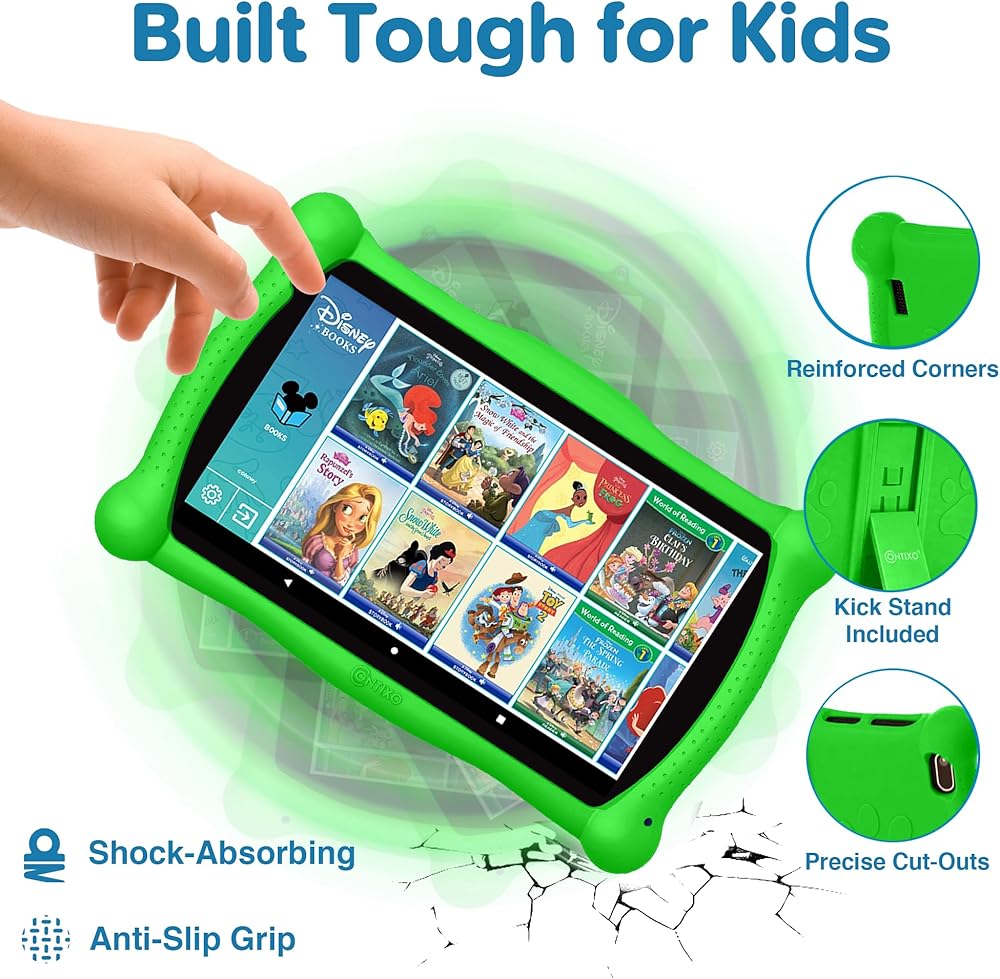 Easier for Kids Hands & Tough: Contixo V10 Kids Tablet with kid-proof case is easy for young children from aged 3 to 10 to hold. Each side and edges are specifically designed to stay slightly above from the screen to protect the Contixo V10 Kids Tablet from the occasional “oops” moments. The Built in kick-stand enables hands free video watching. The Stylus is designed for Kids aged 3-10. Little hands will have an easy time using and controlling this tablet.