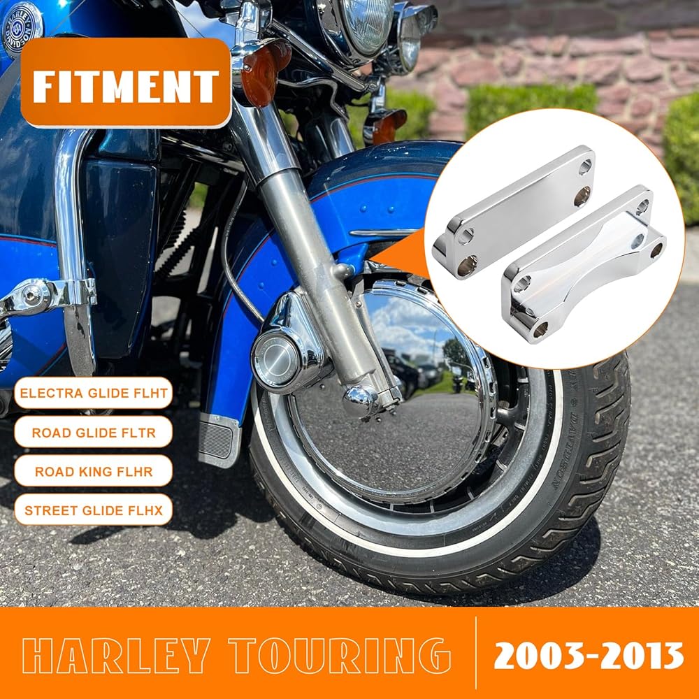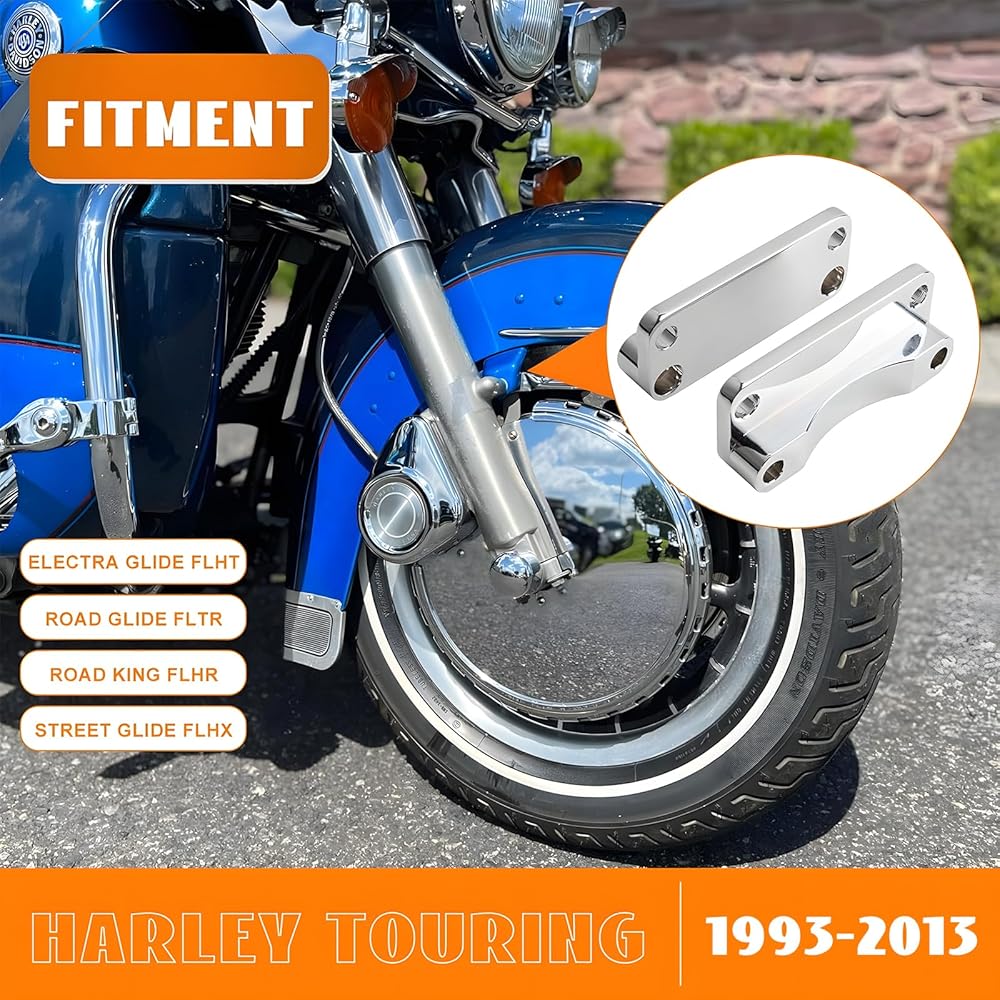 FITMENT - This front fender spacer bracket relocator kit fits Harley Davidson Touring Models 2003-2013, like Electra Glide , Road Glide, Road King, Street Glide, Tri Glide, Ultra Classic, Ultra Limited. Also fits FLHR 1993-2013, FLHT 1995-2010, FLHTCU 1993-2013 FLHTK 2010-2013 FLHX 2006-2013 FLTR 1998-2009.