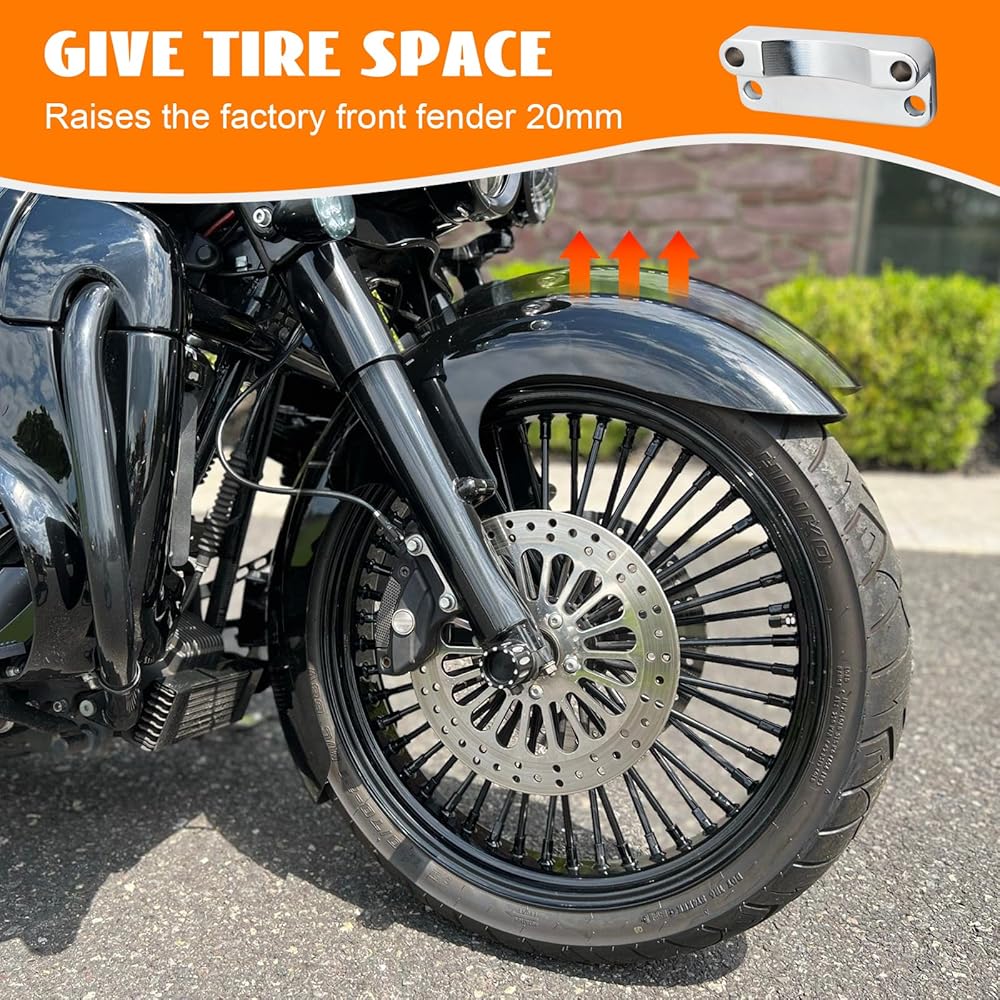 EASY TO INSTALL - The touring front fender lift direct bolt-on, no modification required or re-drilling, the right thread and precise length, no need to purchase separately. The package inclouded : 1×pair of front fender riser kit, 4×nuts,8×screws. If missing mounting parts, please feel free to contact us.