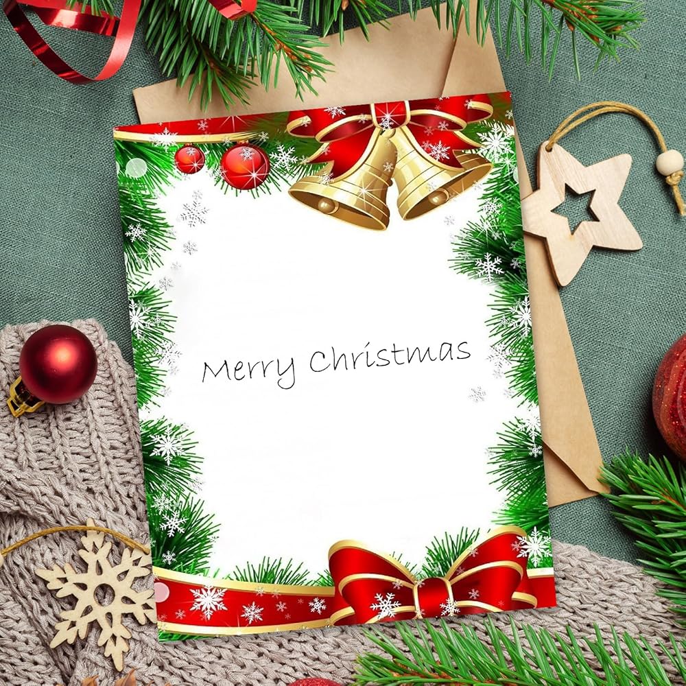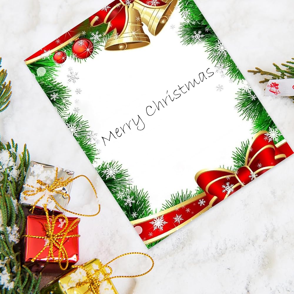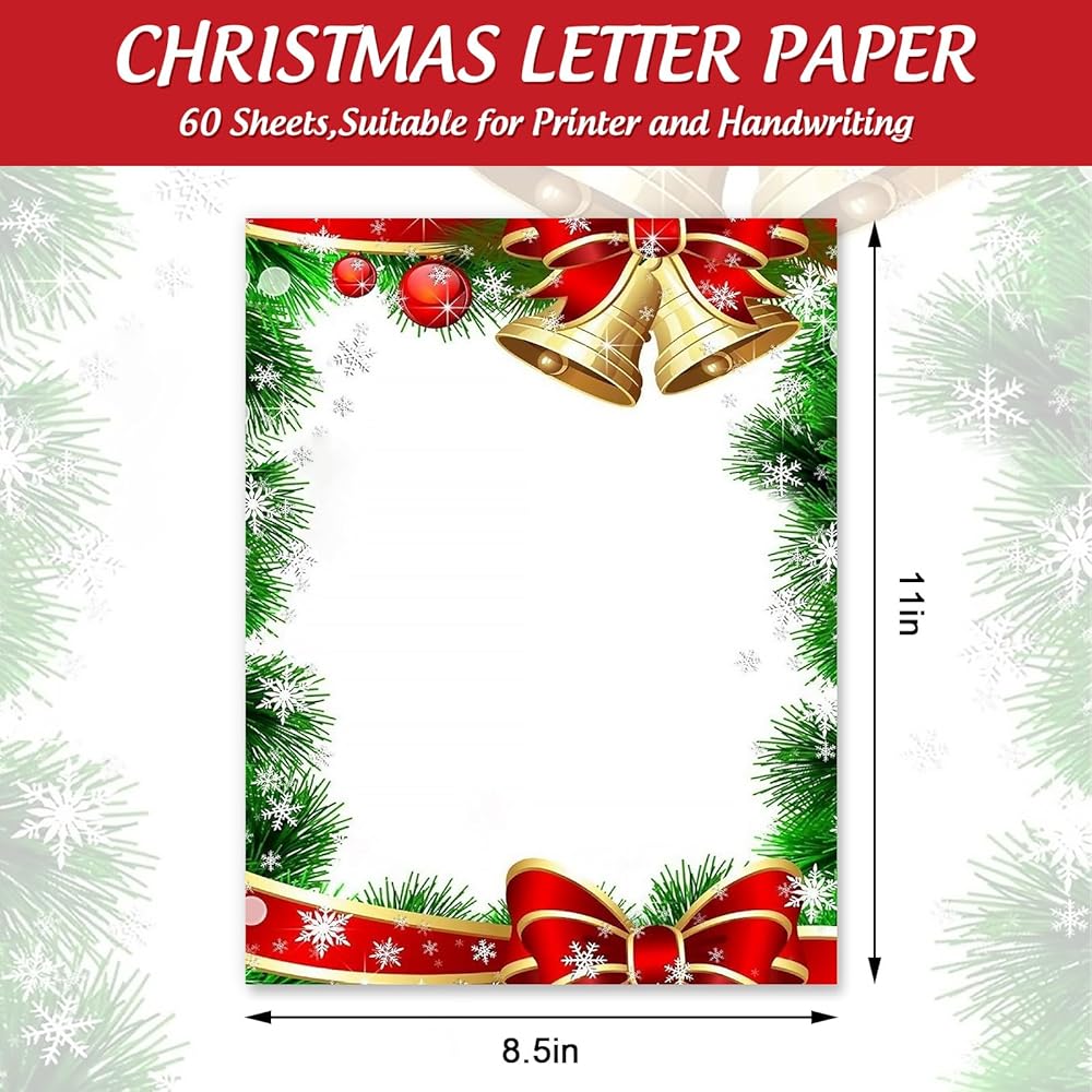 60 sheets Christmas letter paper with bell and bow prints, sufficient quantities to write down your wishes and greetings to your family, friends and Santa.