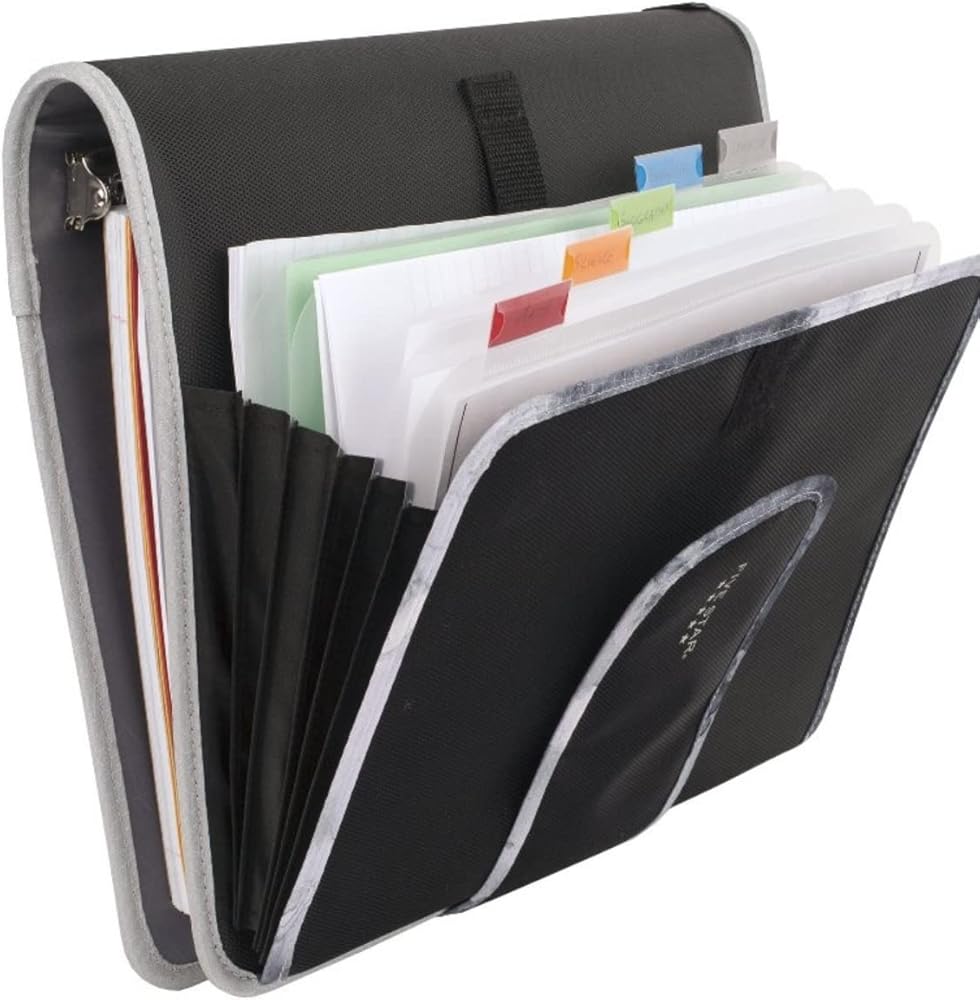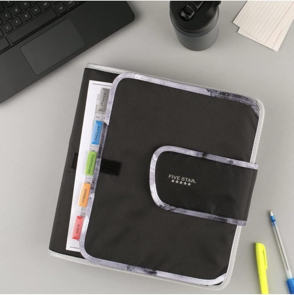 Organize documents in this Five Star 2-inch round ring binder, which features an exterior 5-tab expanding file for maximum storage. This Five Star durable plastic binder has an adjustable Velcro strap to securely hold documents of different sizes and is easily expandable. Store, organize and protect documents with the durable plastic interior, which is guaranteed to last all year. An exterior 5-tab expanding file can be accessed from the binder's exterior. The Five Star 2-inch binder also includes an interior pocket that holds pens, pencils, erasers, sharpeners, calculators and more. Velcro Binder, Black, 380 Sheets. 13-3/4 x 12-1/8 x 3-1/2", 2". Round, 3 Ring. Durable Polyester. Secure internal zipper pocket. Three 2-inch round rings to securely hold pages. Holds over 400 sheets for moderate storage needs. Has a contemporary design on the cover, making it well suited for modern offices and youthful professionals.