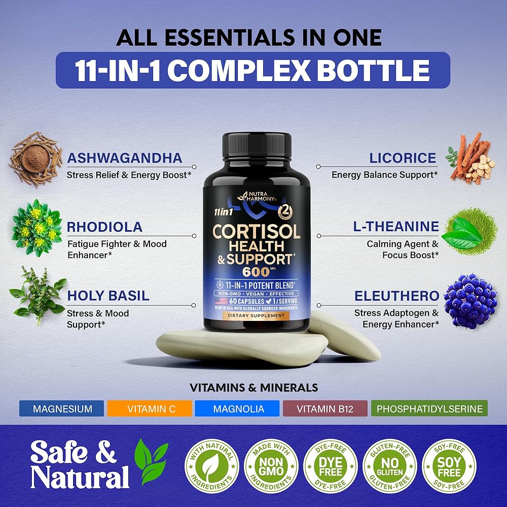 Cortisol Support Complex – Uncover genuine cortisol balance and attain harmony in your body's cortisol levels, enhancing your overall well-being. Say goodbye to strain with our natural formula designed to regulate cortisol. Meticulously formulated from a powerful fusion of herbs & vitamins, it's here to nurture your cortisol harmony.