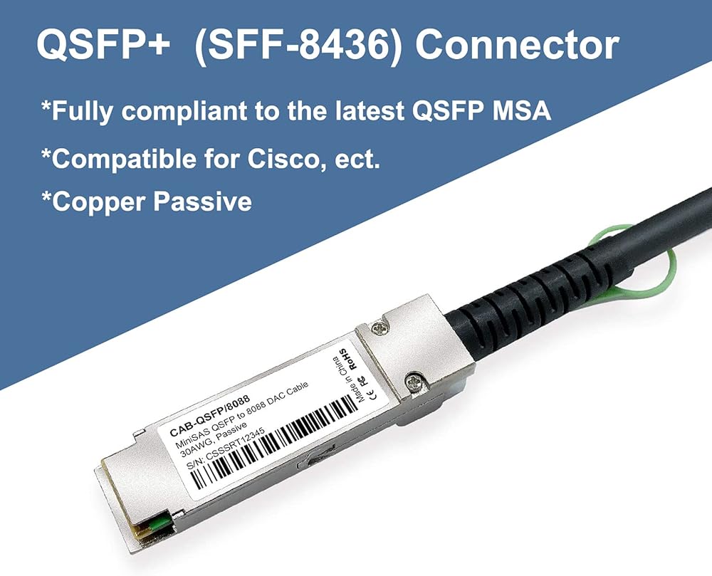QSFP+ (SFF-8436) to SFF-8088 Cable, QSFP compatible for Cisco, Ubiquiti, Netgear, Mikrotik, Zyxel, Linksys, Broadcom, NetScout, ZTE and other open equipment.