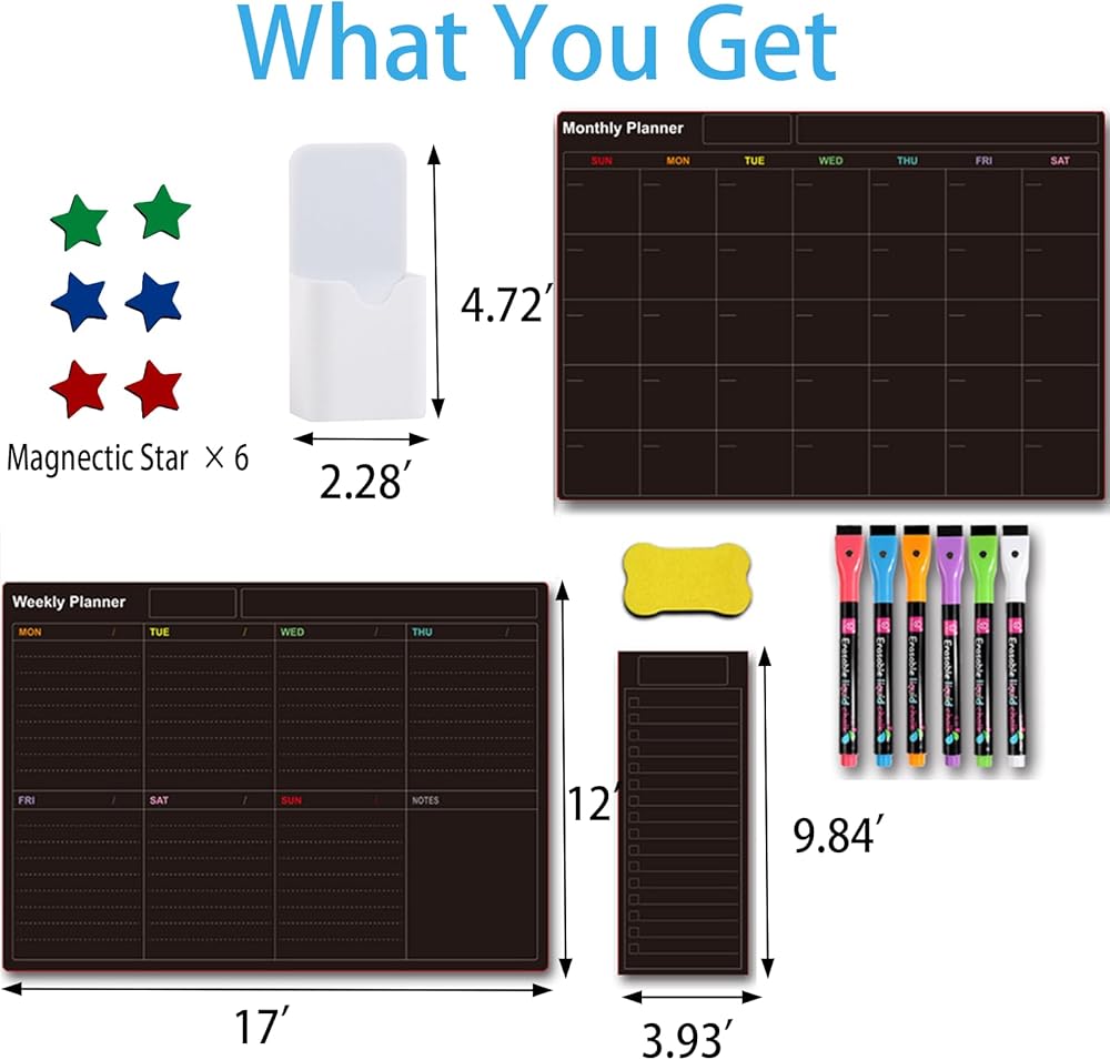 【Product Contents】1 magnetic monthly calendar board + 1 magnetic weekly planner board + 6 colored highlight easy dry erase marker pens with magnets+ 1 pcs magnetic board eraser + 1 magnetic pen holder + 6 magnetic star stickers. All in one Magnetic Fridge Calendar set.