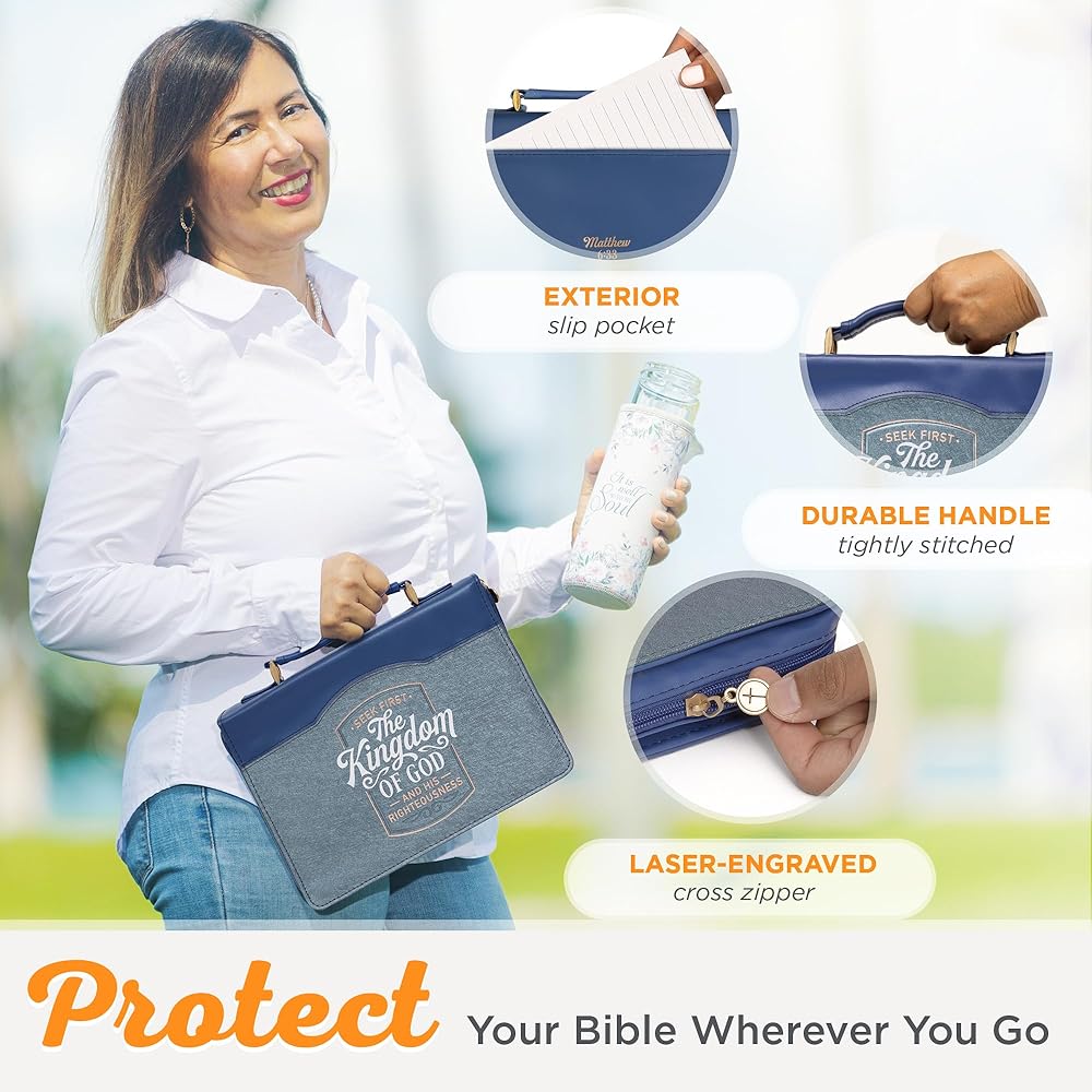 Christian Art Gifts Vegan Leather Fashion Bible Cover Carry Case for Women: Seek First The Kingdom of God - Mat. 6:33 Inspirational Scripture Verse w/Pockets, Pen Storage & Gold, Metallic Blue, Large