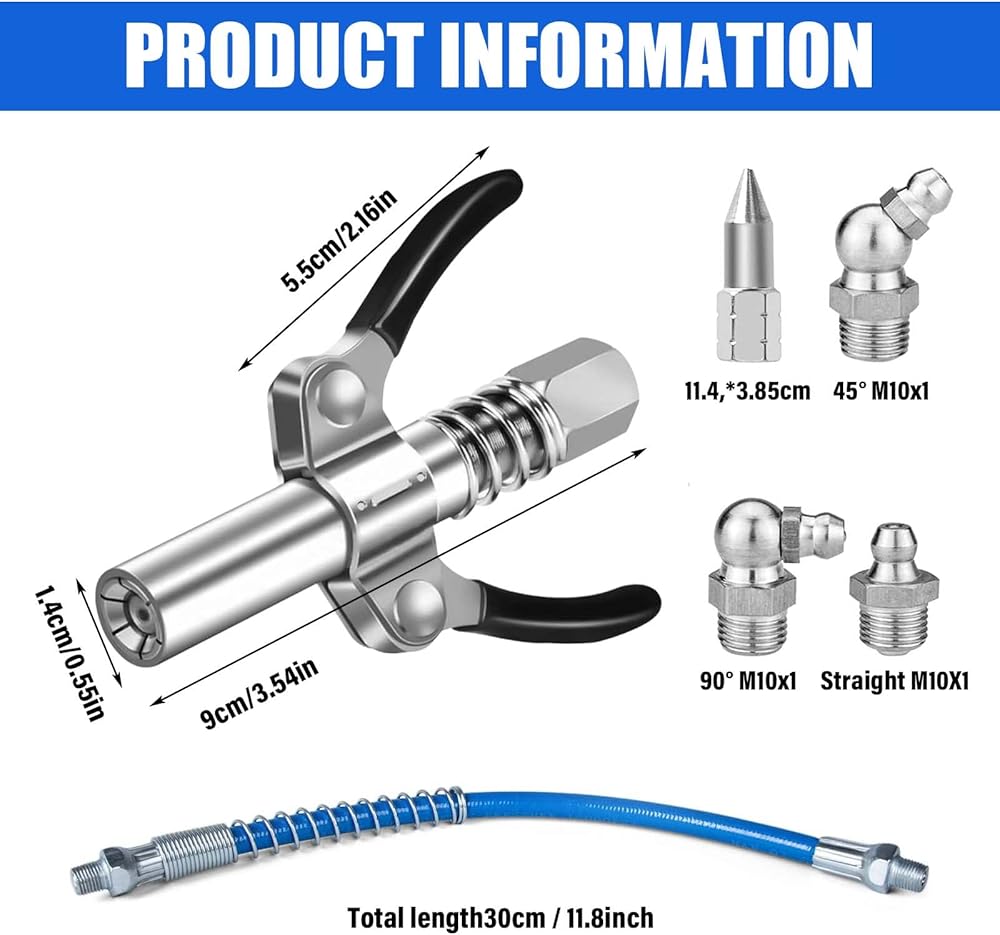 Grease Gun Coupler Kit, Strong Lock on Greases Gun Couplers with 12" Spring Flex Hose, 3 Pieces Grease Fitting, 1 Pieces Grease Sharp Type Nozzle, Quick Release Grease Coupler Accessories