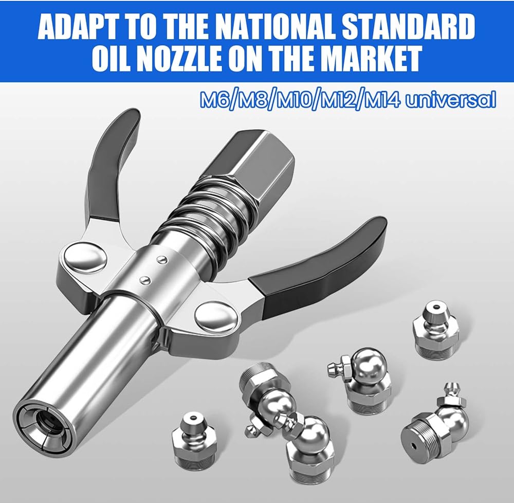 【Six-lobed Locking Jaws】Our grease gun coupler reinforced upgrade 6 jaws design and quality sealing gasket ensures long-lasting and stable performance, strong enough to lock zerk and prevent leakage,and easy to lock and release.