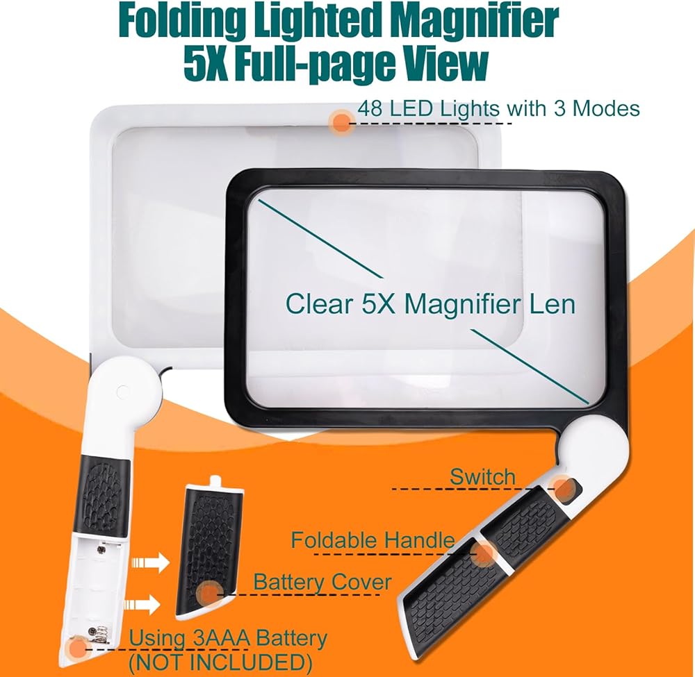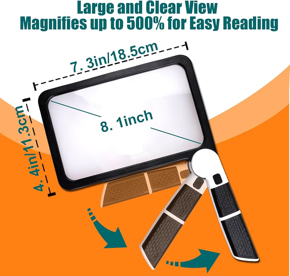 Portable & Ultra-Light : Portable and flexible, our lighted magnifying glass offers comfortable reading. The foldable, 4.65-ounce design allows for vertical or horizontal use without fatigue.