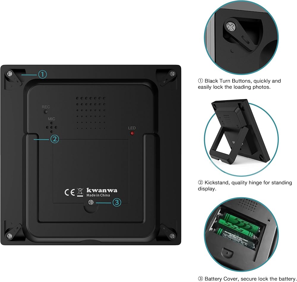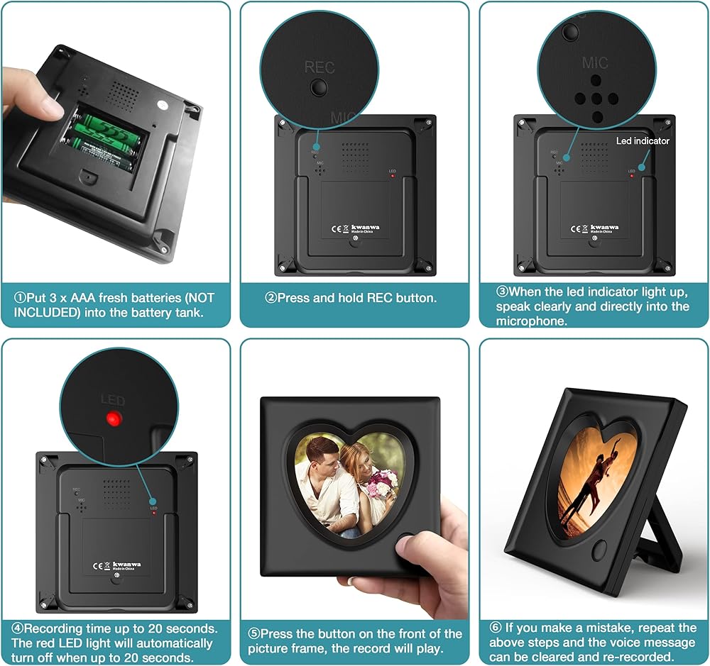 EASY TO RECORD- Open tabs at the back. Put 3 x AAA batteries (NOT INCLUDED) in the battery tank and close tabs. Press and hole the REC button , when LED lights up, speak Clearly into the microphone about 15-25CM. The red LED light will automatically turn off when up to 20 seconds. Press and release the REC, the recording will be erased. Press the button of the center picture front, the recorded voice will play.