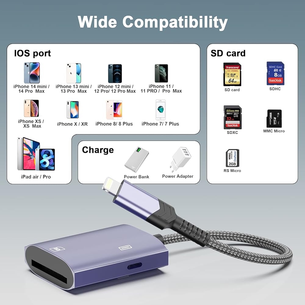 📼【EXTENSIVE COMPATIBILITY,NO DRIVER REQUIRED】: The camera memory card reader is compatible with iPhone 14/14 Pro/13/12/Xs/Xs Max/X/8/8 Plus/7/7Plus/SE and iPad Air/Mini/Pro. Support SD, SDHC, SDXC, MMC Micro, RS MMC, Micro SD, Micro SDHC, Micro SDXC in UHS-I mode.