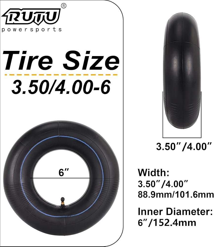 【Upgraded Inner Tube】Inner Tube 4.10/3.50-6 with Angled Valve Stem Aluminum Alloy Stem Valve Cap, compatible with a 6" rim(13" Outside Diameter), depending on the manufacturer, this inner tube universal fits following tire sizes : 4.00/3.50-6 | 4.00-6 | 3.50-6 | 400/350-6 | 400-6 | 350-6 | 4.10-6 | please check for the details and size to make sure this part will fit