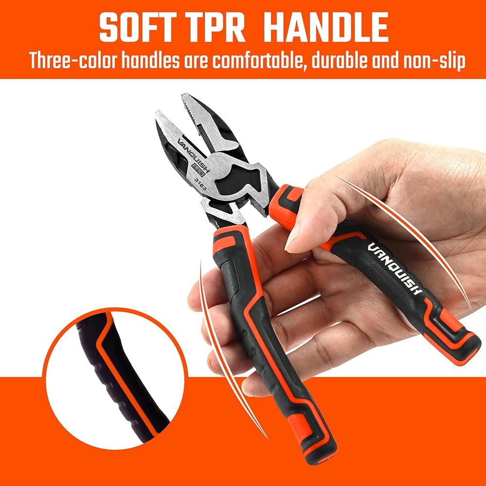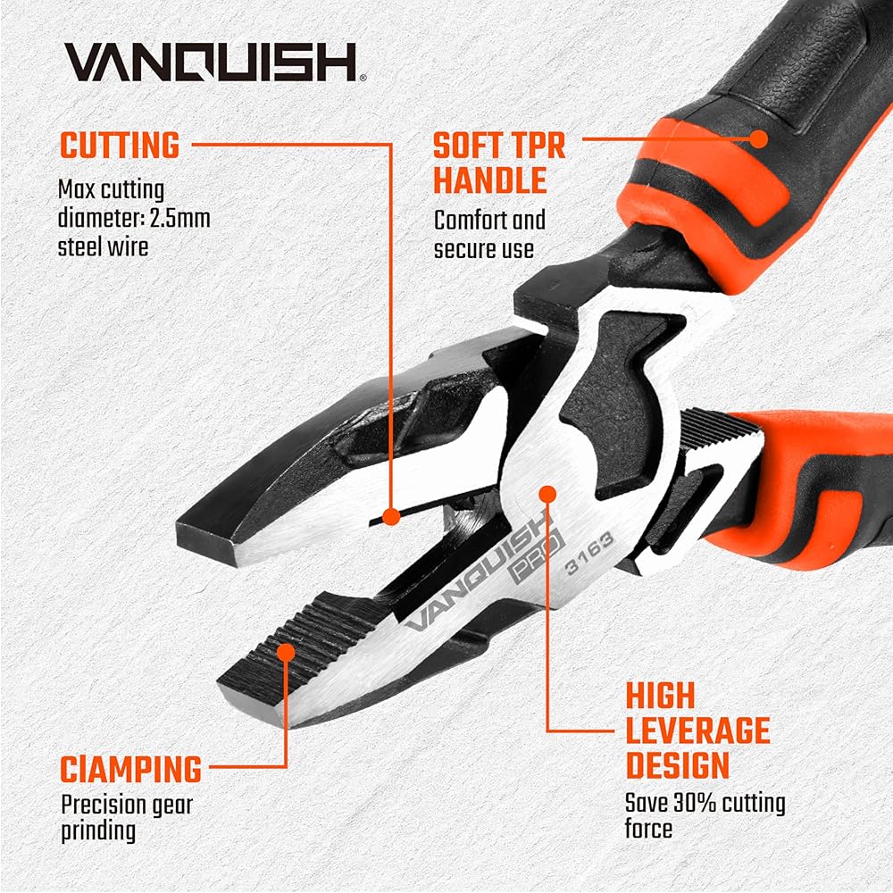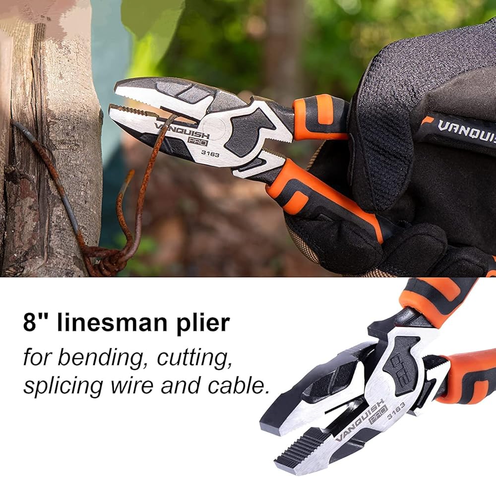 EXTENSIVE USES--Vanquish linesman pliers is great for twisting or cutting most hardened wires, nails and small fasteners and clamping screws.