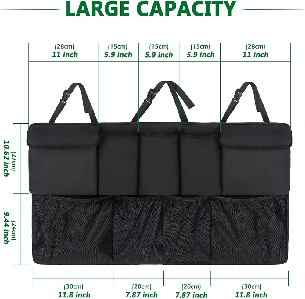 Car Organizer Bag - 20.5"H x 40.9"L ,Large car organizer hanging bag with 9 roomy pockets,This car trunk organizer fits for SUVs, Hatchbacks, Crossovers, Minivans, MPVs, Station Wagons & Jeeps. (Measure your car seat back before buying)