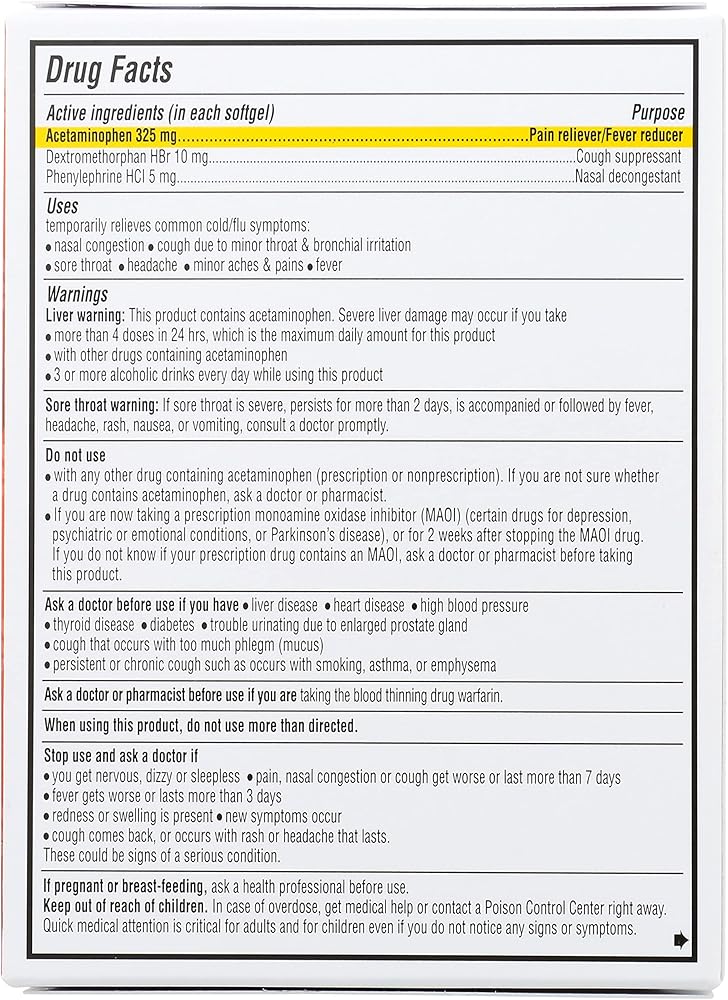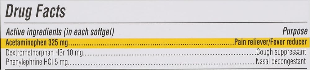 FEVER & PAIN RELIEVER: Acetaminophen 325mg in each softgel temporally relieves common cold symptoms like minor aches and pains, headache, sore throat, and fever— while cough suppressant and nasal decongestant offer sinus pressure relief.