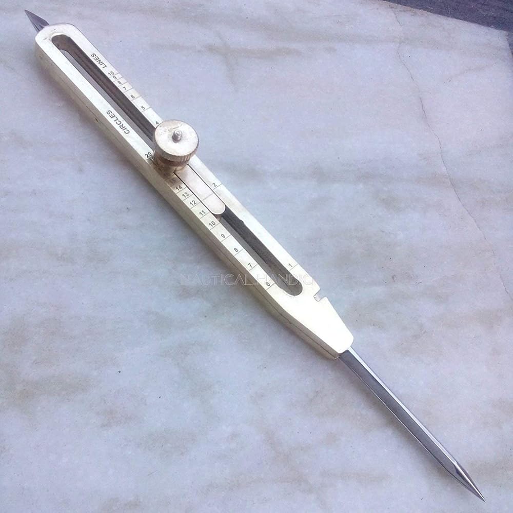 Brass 9 in. Proportional Divider Steel End For Sharp Point This detailed item measures approximately 9 inches Point To Point and 3/4 inch wide. Among several functions, proportional dividers can be used to increase or decrease lengths of lines and diameters of circles, and can they be used to inscribe regular polygons within circles (dividing the circumference of a circle into equal parts). Fine piece of drafting equipment-very well made. NOTE: No guarantee on the accuracy, as this depends on the person using the item. ( for example if you do not have short end set at exactly 1 in and the long end set at 3 in you will not have a 3 in to 1 in ratio