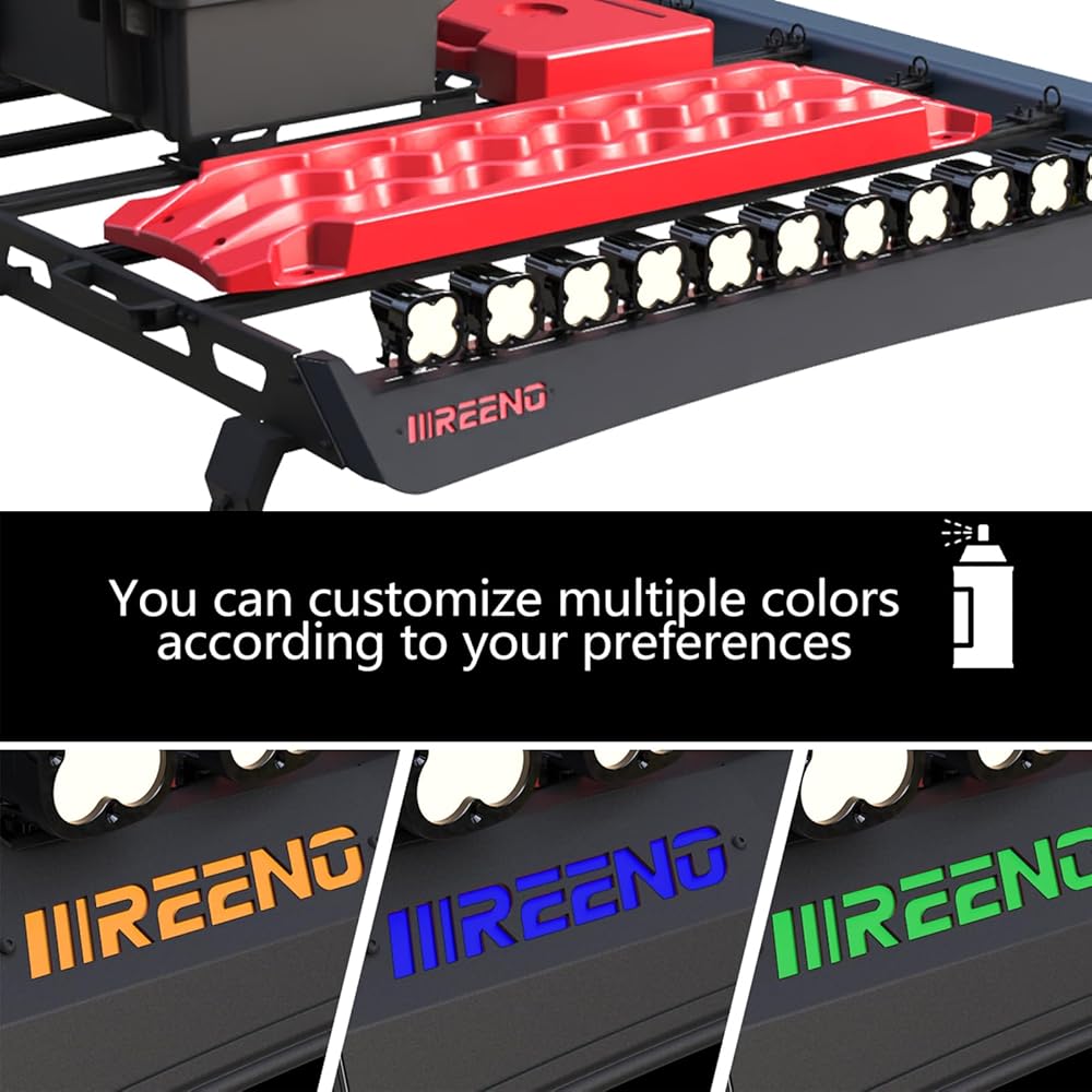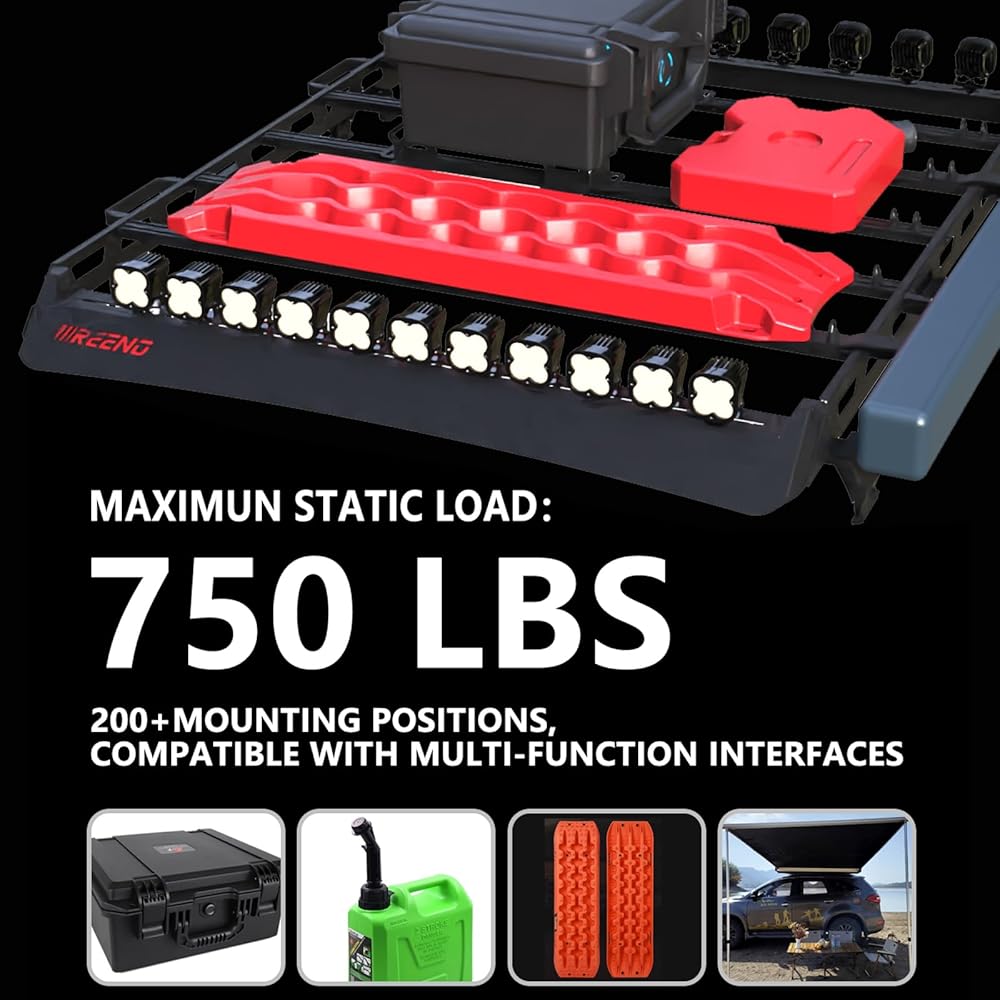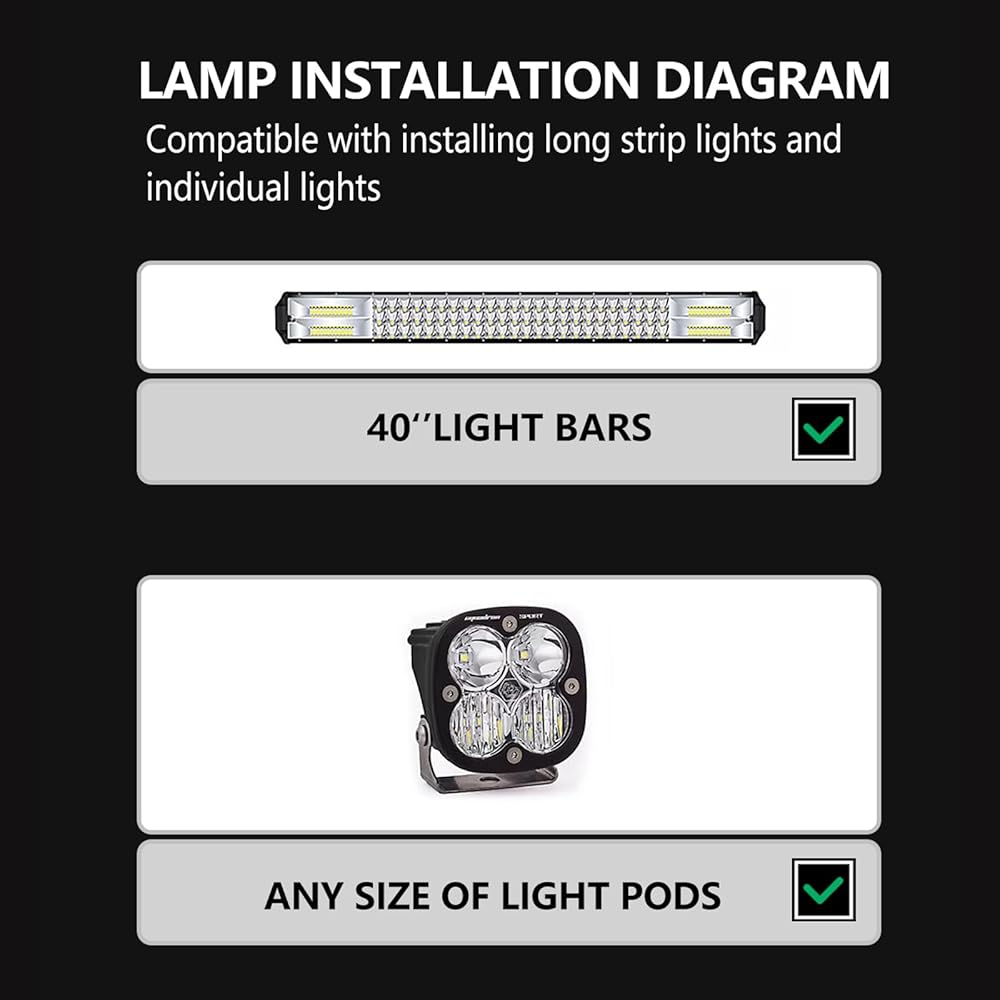 【Function 】Includes 5 extruded aluminum load cross bars. The crossbars are made from aluminum extrusion and apply the textured black powder coat finish . Reliable assistance for your outdoor activities. Provide stable support to mount your gears, like tents, camping stoves, awnings, luggage, survival tools, shovels, pods, extinguishers, etc. Mounting holes for up to 40" light bars (exclude.).