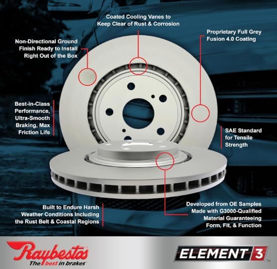 Raybestos 980470FZN Element3 Rust Prevention Technology Coated Front Disc Brake Rotors use a propriety finishing technology to coat each rotor's entire surface, including the cooling vanes, to ensure optimal airflow and cooling. The full Grey Fusion 4.0 coating helps resist corrosion and significantly delays rust-induced performance issues. Three years of field testing prove these rotors stand up to rain, salt and snow for optimal breaking performance and the non-directional ground finish gives you a product that is ready to install right out of the box.