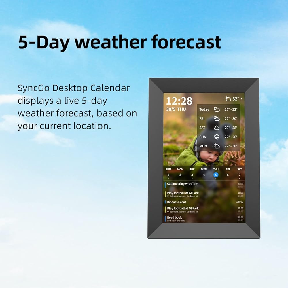 التقويم الرقمي الذكي - أحدث تصميم بأعلى جودة وميزات مبتكرة. يوجد هذا على المنضدة أو المكتب أو الطاولة لعرض التاريخ وتوقعات الطقس والظروف الحالية وصورك المفضلة والتقويم والجدول الزمني الخاص بك حتى لا يفوتك أي تاريخ أو موعد أو نشاط. اجعل الحياة أسهل وأكثر متعة مع التقويم الرقمي SyncGo.