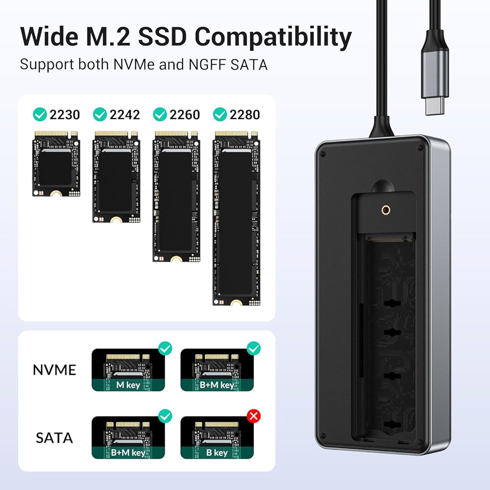 Combination SSD Docking Station - This m.2 dock features a built-in M.2 SSD enclosure which support NVMe(M+B key&M key) and SATA(B key&M Key) ssds with size of 2230/2242/2260/2280. This m.2 docking also includes a variety of interfaces for optimal productivity. These ports include 1xPD100watts input, 1xUSB3.2 Gen2 10Gbps, 2xUSB 2.0 480Mbps, 1xType-C 10Gbps, 1xHDMI2.0 4K@60Hz, 1xRJ45 gigabit Ethernet. NO SD/TF ports.