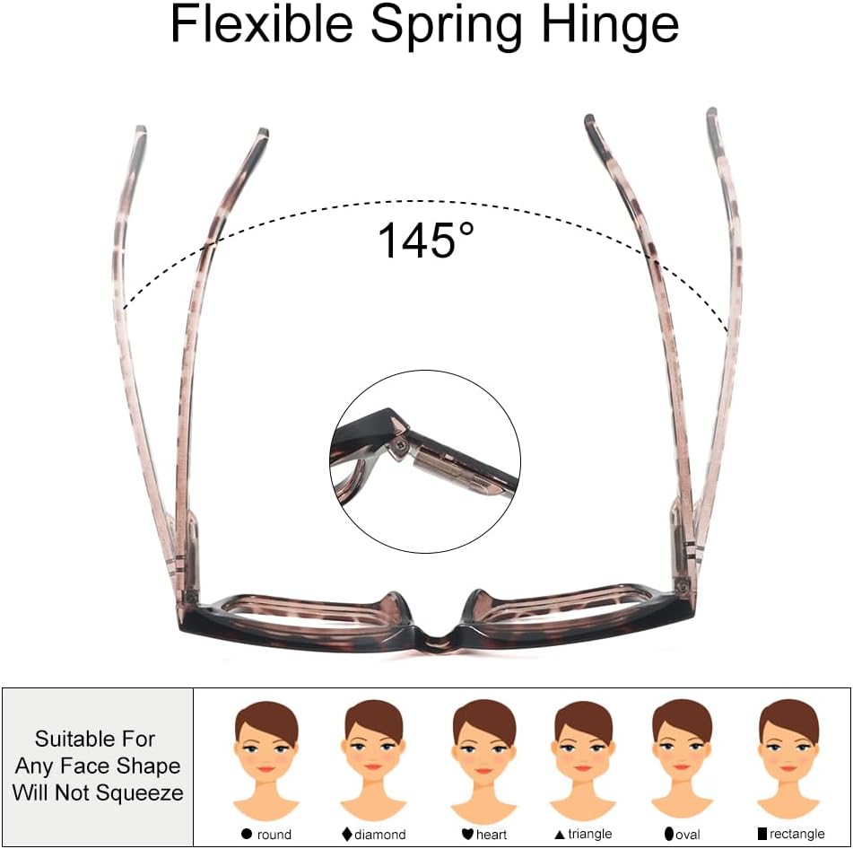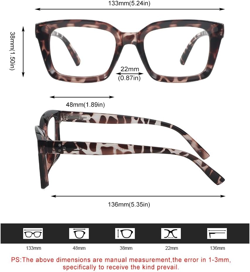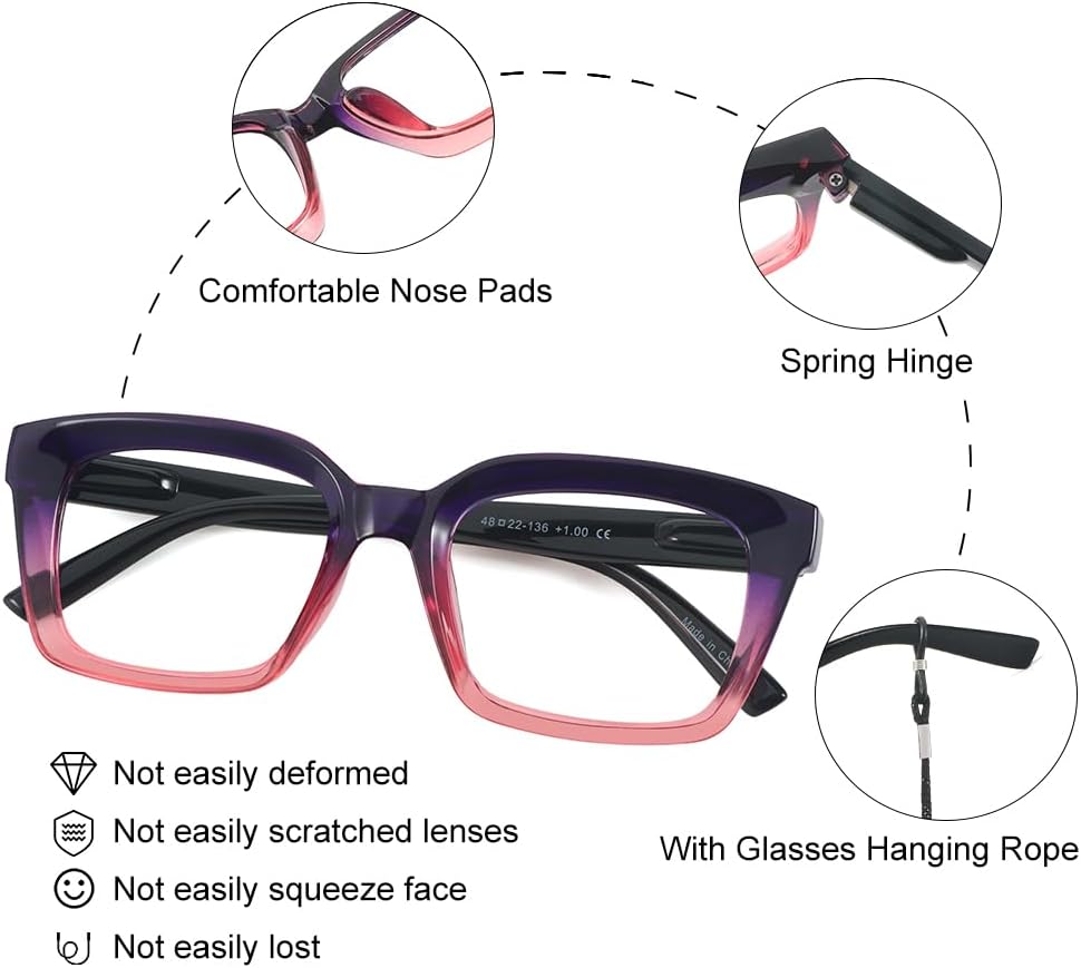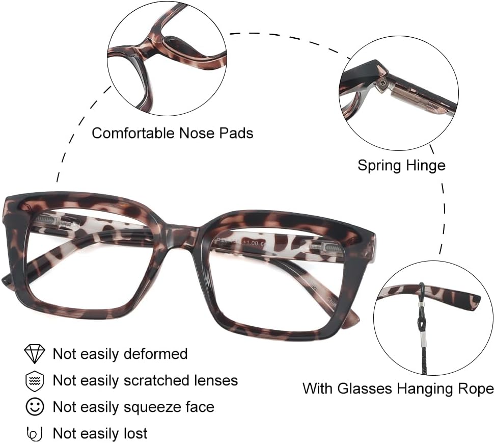 Oversized Square Design:Classic square shape reading glasses for womens,tortoise and pink colors make you look younger,suitable for any face shapes.And can be matched with any outfit and any occasion.