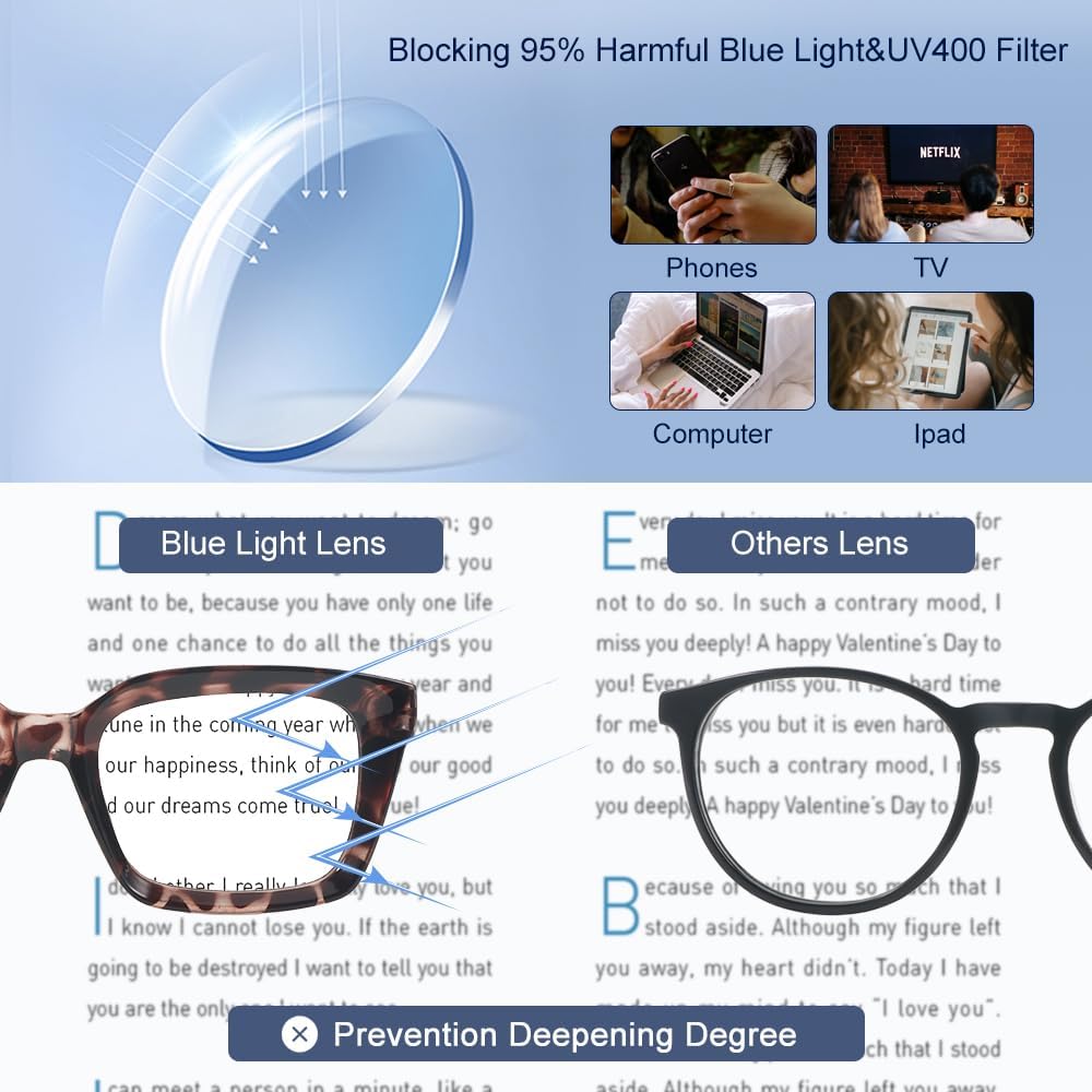 HD Anti-Blue Light Lenses:Our blue blocking glasses lenses will not turn yellow,return true vision,don't hinder reading.At the same time,it can well block harmful rays and prevent the degree from deepening.