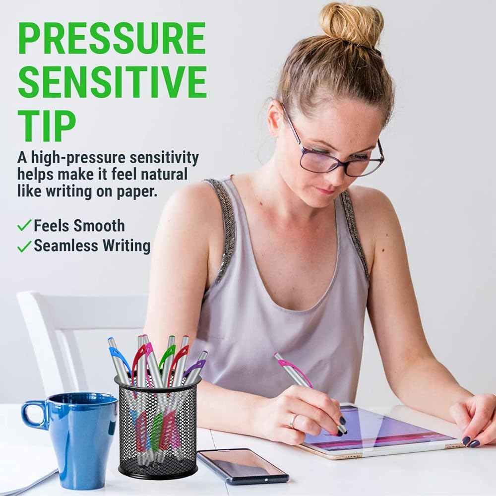 SyPen's 2 in 1 Ballpoint Pen & Stylus Pen for touch screen devices glides smoothly across smartphone and tablet screens, which protects the screen from scratching or fingerprints, promoting the longevity of your devices. The two in one ballpoint pen and stylus pen design gives you more bang for your buck, as it is truly multi-functional and will take you from home, to the classroom or office, and back again. You can use this pen for everything from jotting notes into a notebook to doodling on your tablet. Choose from many different color variations to switch things up according to your mood and environment. The lightweight material and comfortable rubber grip make this pen the perfect choice for Schools, students, offices, home, artists, avid notetakers, and anyone who writes for extended periods of time as it won't tire you out and molds to the contours of your hand. The highly sensitive tip provides great detail and accuracy and will enhance your experience with note taking, sketching, drawing, and photo apps. SyPen's 2 in 1 Ballpoint Pen & Stylus Pens are compatible with a multitude of different devices and can be used with your smartphone,tablet, or paper. Our stylus/ballpoint pens provide all-in-one convenience with sleek sophistication & style that is sure to make an impression.