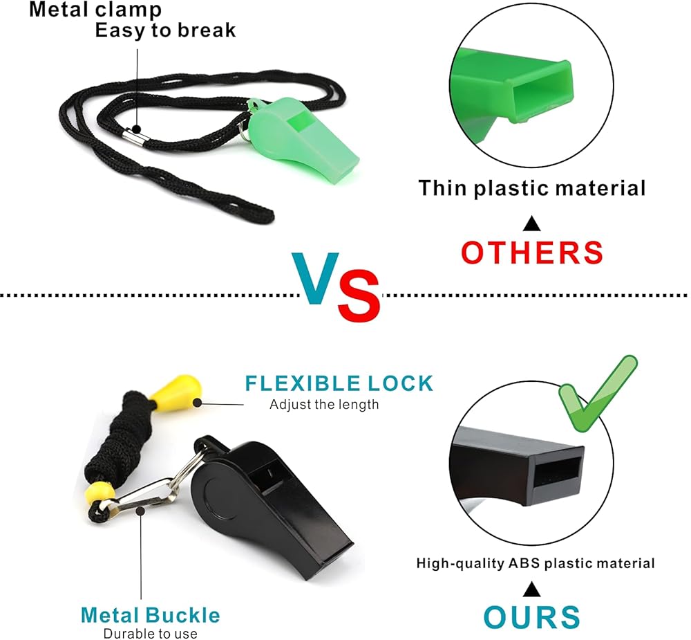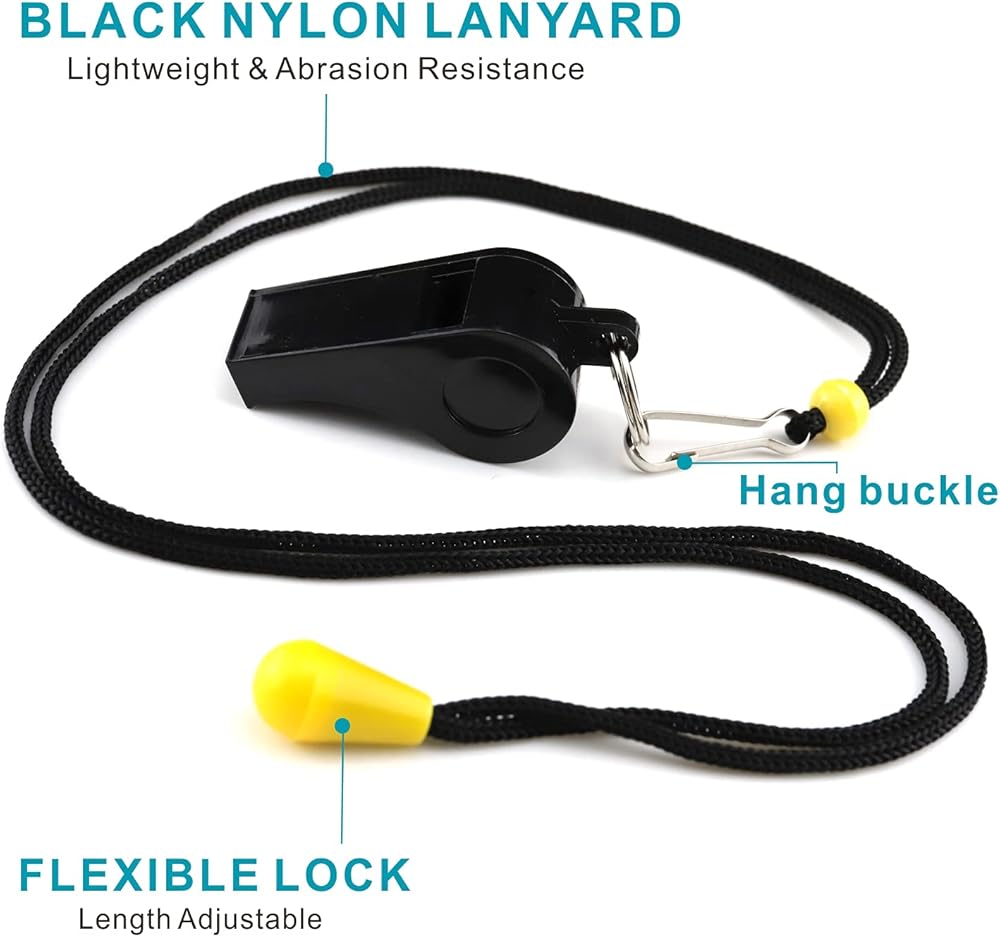【Whistle with Lanyards】: Unlike the metal clamp holding the lanyard together, our whistle use flexible lock to avoid come apart suddenly. 19" black breakaway lanyard designed to hang around neck or wear it on the wrist for hand free.