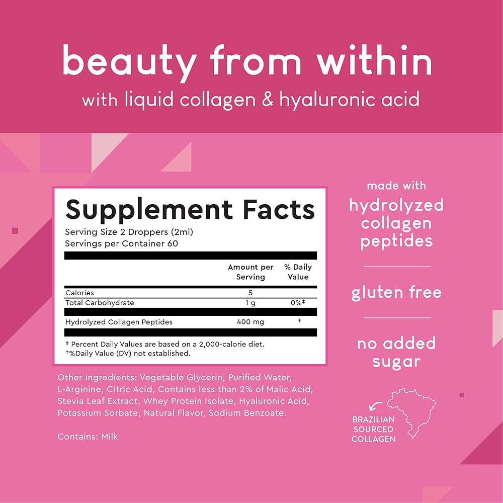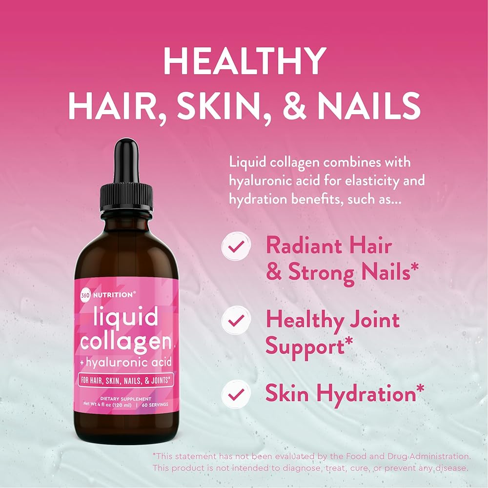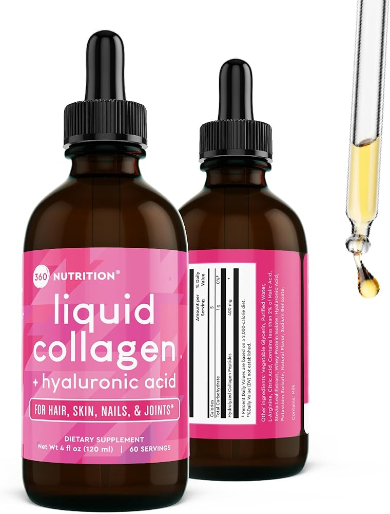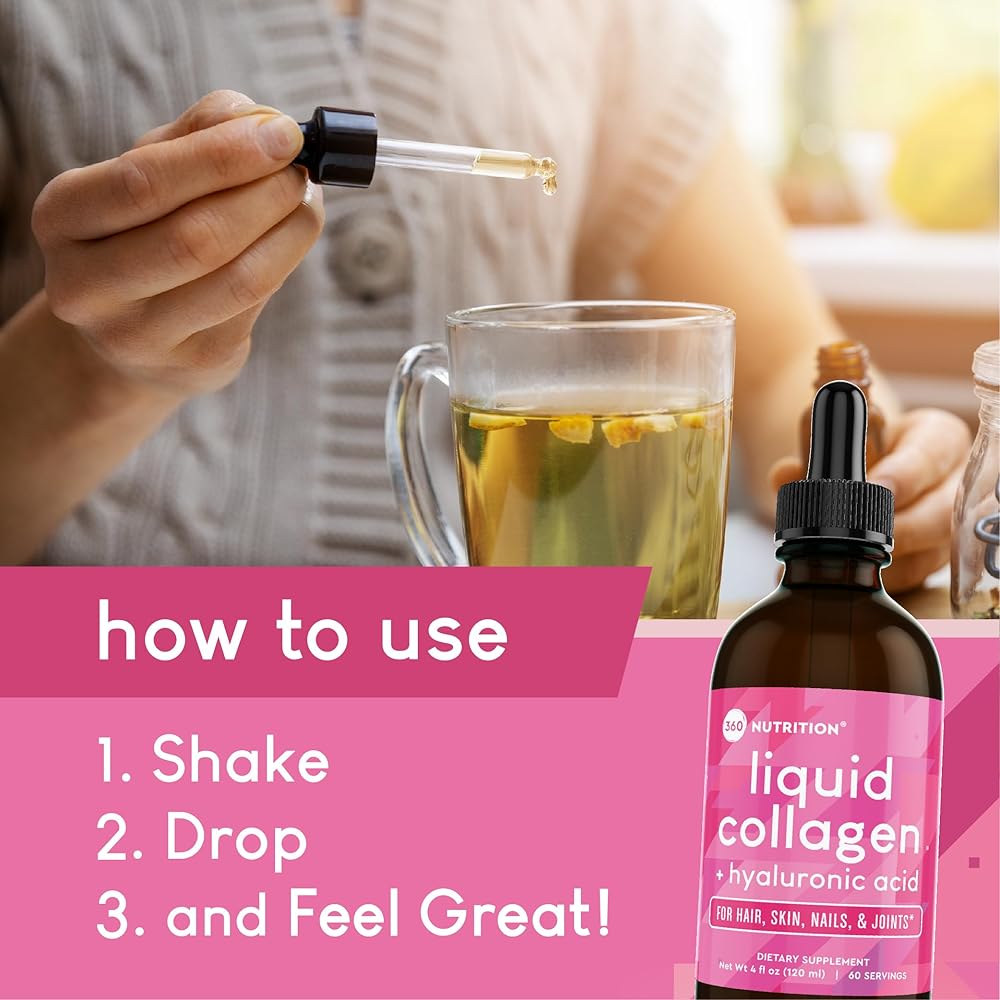360 Nutrition Liquid Collagen + Hyaluronic Acid Drops are non-GMO, gluten-free and formulated for a clean, natural boost for your body, inside and out. Brighten and restore your skin with the help of collagen's protein and amino acids, and provide hydration and nourishment to your scalp and nails with hyaluronic acid. Just shake and add two droppers to any recipe, drink, or water. Made with Brazilian-sourced hydrolyzed collagen peptides. Contains no added sugars or fillers.