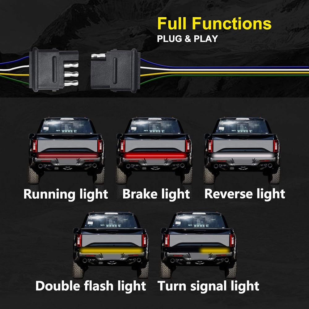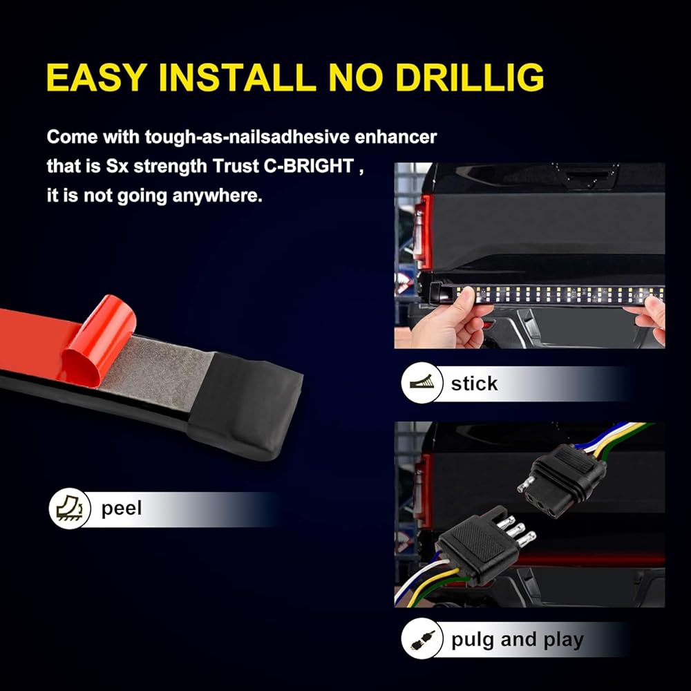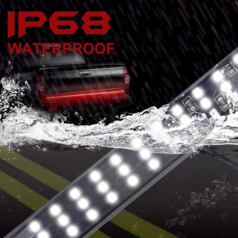 【Quick Installation & Waterproof IP67】: No Drill Install. Self-adhesive genuine 3M tape and well conductive standard 4-pin flat plug can easily stuck on where you need.The LED Tailgate Light Bar with IP67 waterproof rate ,works good whatever in rainy or snowy days.With inline fuse for short circuit protection,the truck tailgate bar can be super durable.