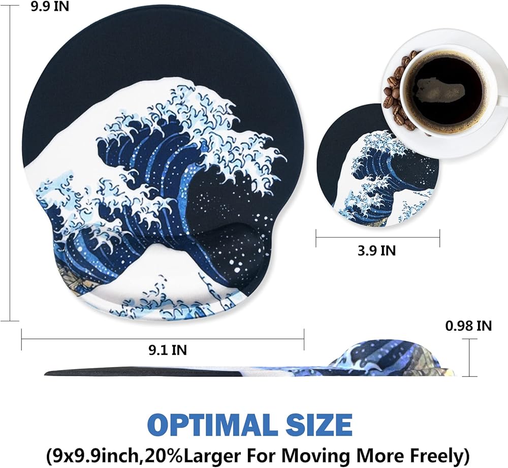Optimal Size and Shape. the Wrist Rest mouse pad is 9.1 in x 9.9 in ( 5mm-thick ), and the cup coaster is 3.9 in x 3.9 in, ideal for office work, home, travel or other. You can move the mouse around easily and freely.