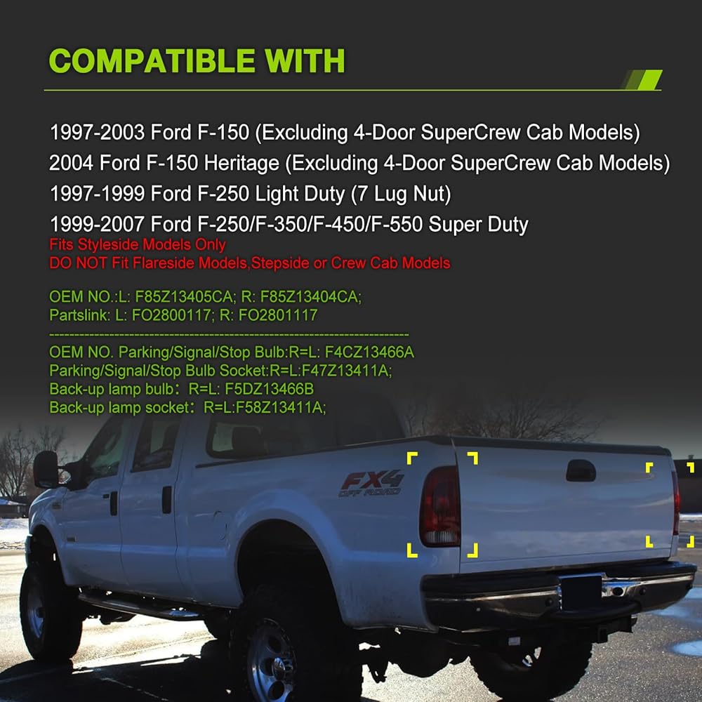 Compatible with 1997-2003 Ford F150/2004 Ford F150 Heritage(Excluding 4-Door SuperCrew Cab Models)/1997-1999 Ford F250 Light Duty (7 Lug Nut)/1999-2007 Ford F250 F350 F450 F550 Super Duty Fits Styleside Models Only/Don't fit Flareside Models,Stepside or Crew Cab Models.