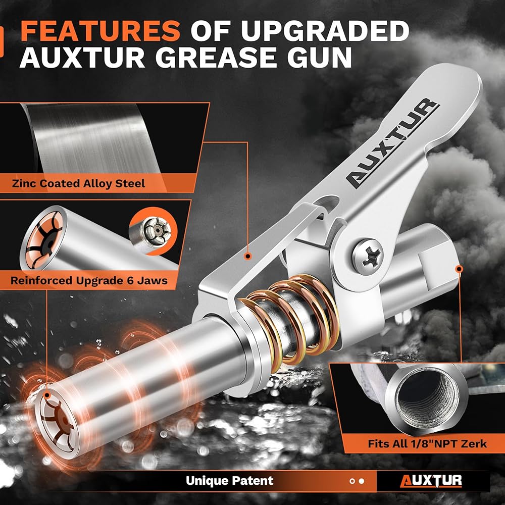 【Unique Design 】: AUXTUR upgraded grease gun coupler have the unique and patented Retract Mechanism pull back the inner seal and leave outer socket ring wide open,which help locating zerk fittings at blind spot.