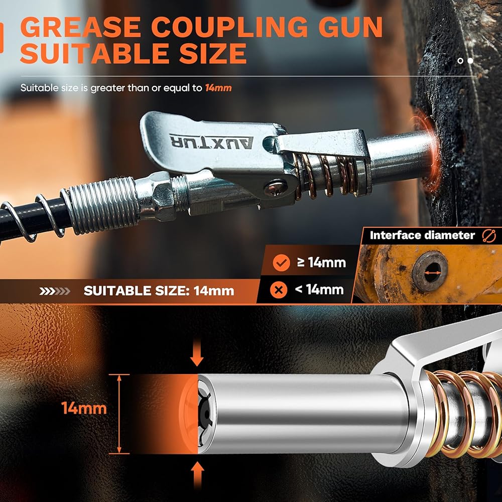 【Upgraded and Sealing】: AUXTUR grease gun coupler even under extreme pressure of 14000 PSI. AUXTUR grease gun coupler reinforced jaws and quality sealing gasket ensure long lasting and stable performance. The diameter of AUXTUR grease gun fittings is 18mm, for fittings with a diameter of less than 18mm, we do not recommend their application.
