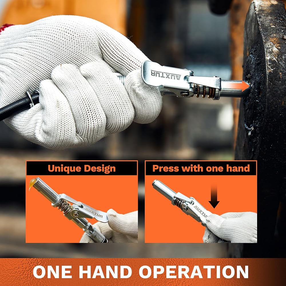【One Hand Operation】: AUXTUR grease gun coupler features a smooth retraction mechanism for one-handed operation, eliminating the need to hold while lubricating and freeing up both hands to operate the grease gun when locked into the grease gun coupler.