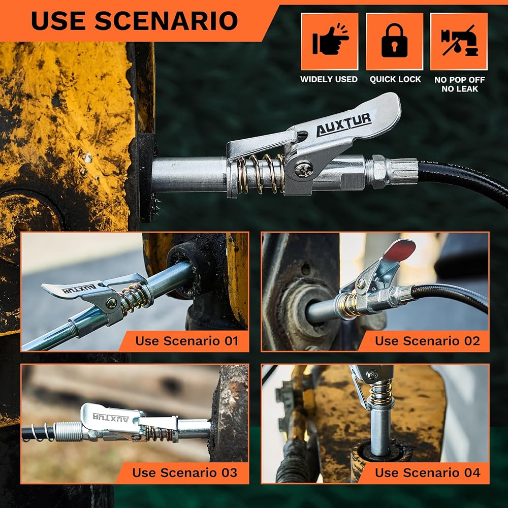 【Wide Application】: AUXTUR grease gun coupler fit all 1/8" NPT standard grease guns, pneumatic grease guns, manual grease guns, electric grease guns, also all DIN and SAE grease nipples and all SAE and metric Zerk couplings, simply replace the existing grease gun coupling, this heavy duty tool is excellent for use on construction sites or in car mechanic's garages for large machinery, and on farms for Tractors, ploughs, stump pullers, disc harrows, seeders etc. are the perfect lubrication tool.