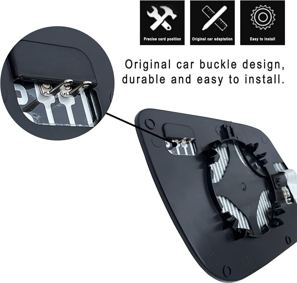 【EASY TO INSTALL】: OEM design, directly and firmly install. To snap the mirror all the way on without breaking it you can use the tilt adjustment on the driver door to tilt the mirror mechanism all the way down before installing then use a long screwdriver to hold against it while snapping the mirror on. The two bottom clips slide in then the top two snap into place.No adhesion needed.