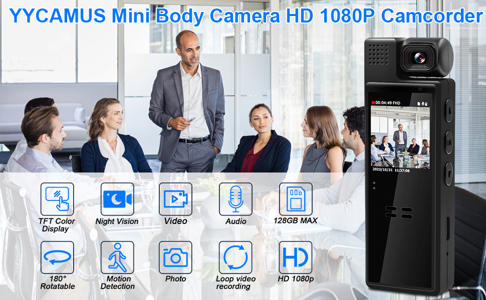 『Portable Camcorder Design』Equipped with 180° rotatable lens that allows you to easily adjust the angle. The 1.3-inch high-quality screen can focus on the scene you need to shoot and play or delete video/audio/photos on body cameras freely. Ideal for meetings, travel, outdoors and law enforcement, ensuring clear evidence and records in any situation.
