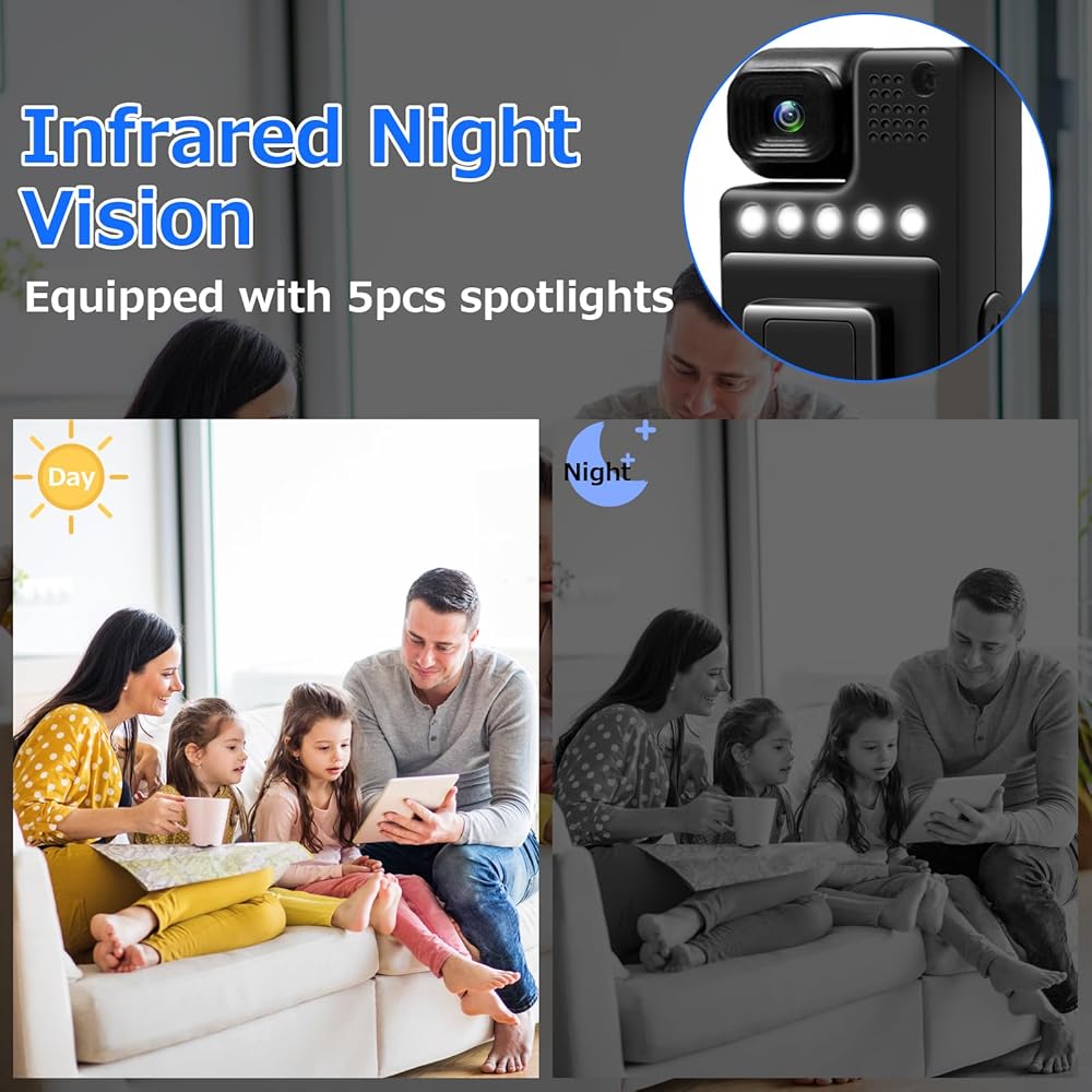『Loop Recording & Night Vision』Supports up to 128GB micro sd card (not included) and loop recording. When the memory card is full, our screen recorder automatically overwrites the oldest files to continue recording. With 5 pcs infrared lights, you can enjoy unparalleled clarity in dark environments by this body camera.