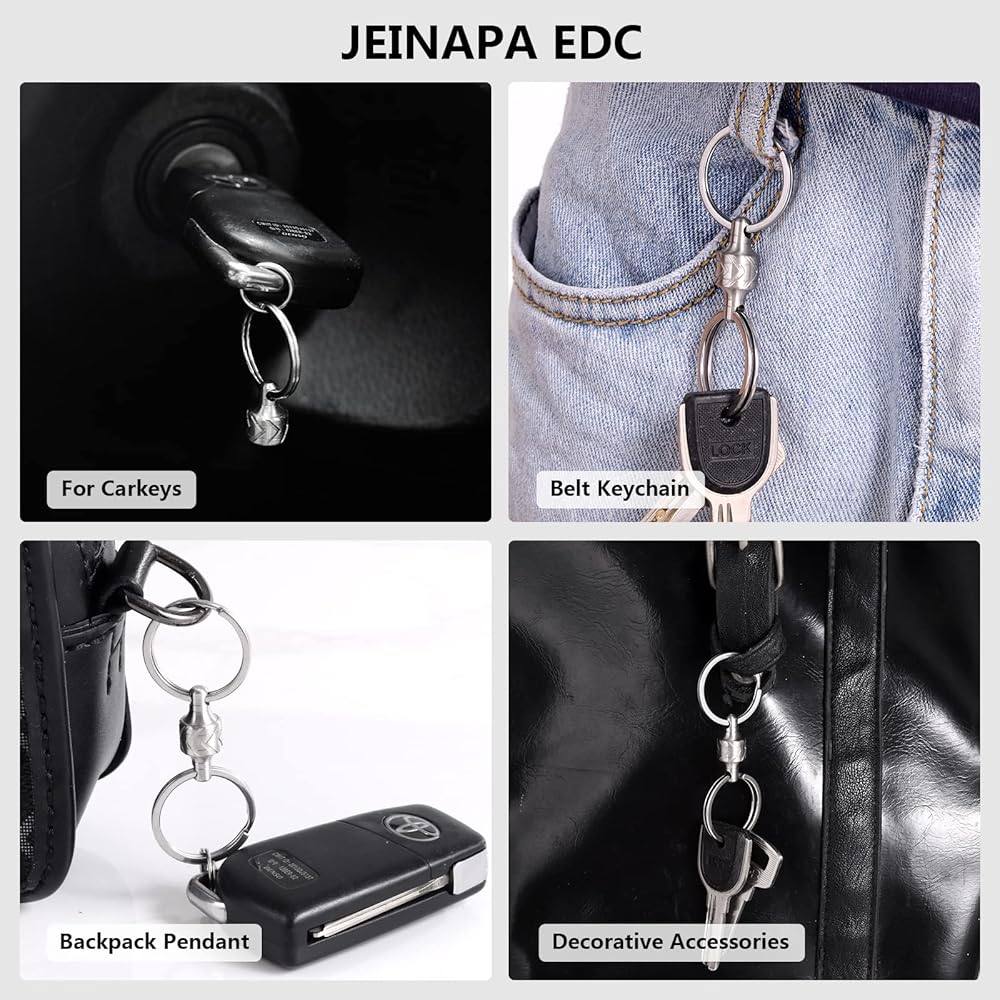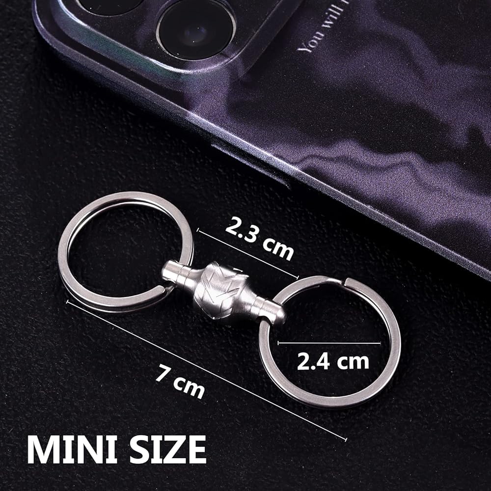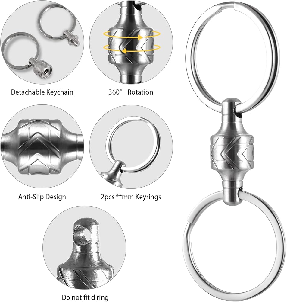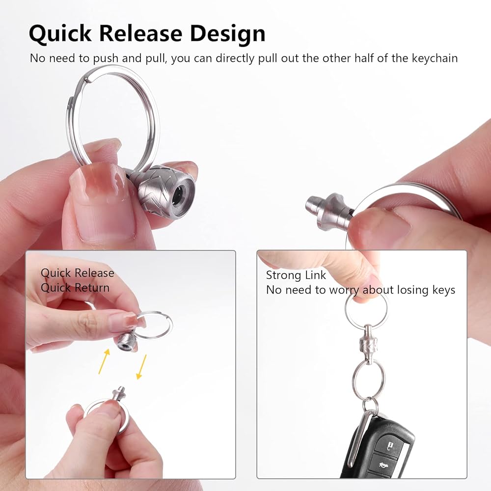 【Easy Key Retrieval】Our Quick Release Keychain allows you to effortlessly retrieve your keys with a simple operation. Press the button, and the keychain instantly releases the keys, eliminating the hassle of tedious removal processes and allowing you to quickly access the keys you need. 【360° Free Rotation with Anti-Slip Design】The keychain features a 360° free rotation with an anti-slip design, ensuring that your keys do not tangle or get entwined. You can freely rotate the key loop to select the desired key, while the anti-slip design keeps the keys securely in place, preventing accidental loss. 【Sturdy Stainless Steel Construction】Crafted from durable 316L stainless steel, our keychain boasts excellent durability and corrosion resistance. Whether for daily or long-term use, it remains stable and reliable, providing secure protection for your keys. 【Portable and Easy to Carry】The compact design of the keychain makes it highly portable. It easily fits into pockets, wallets, or keychains, allowing you to conveniently carry it with you wherever you go. 【Versatile Applications】In addition to serving as a keychain, it can also be used to secure other small items such as pendants or small tools. This versatile functionality offers added convenience and practicality.
