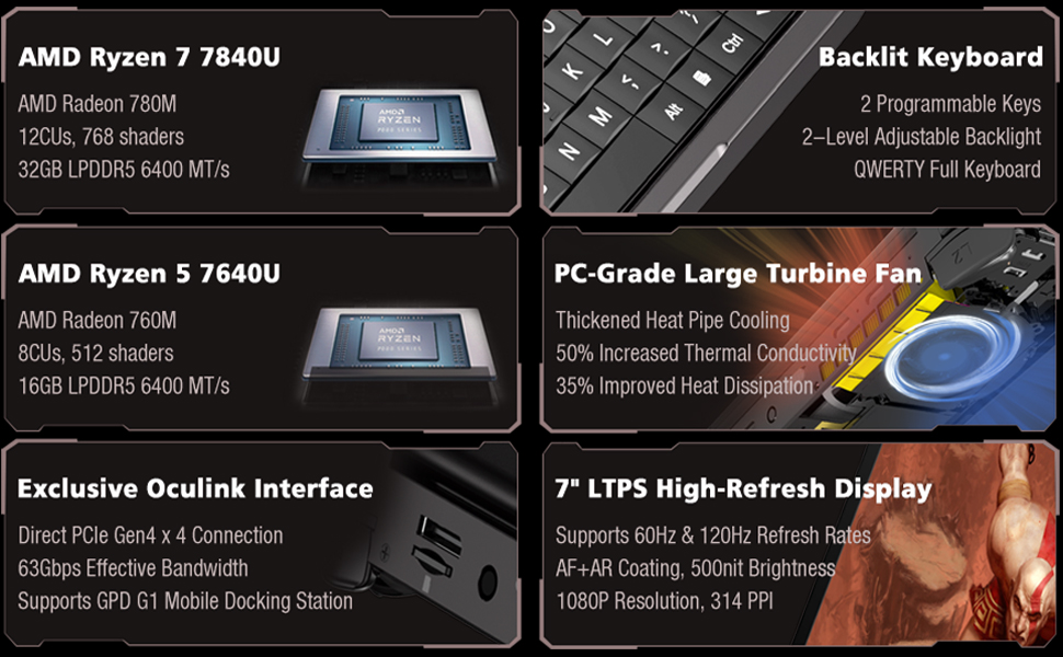 GPD Win Mini 's CPU: AMD Ryzen 7- 7840U processor, 8 Cores/16 Threads. Base Frequency 3.3 GHz Max Turbo Frequency Up to 5.1 Ghz Graphics: AMD Radeon 780M RNDA3 Graphics card. graphics framework 12 graphics cores / 2700 MHz graphics Frequency.