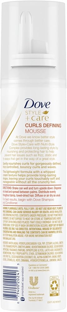 Better style comes through better care. That's why Dove has reinvented its styling collection to nourish and protect hair for a long-lasting, beautiful style. Dove Mousse Curls Defining with Nutri-Style Complex gently nourishes while providing long-lasting volume and bounce so you can enjoy touchably soft hair all day long.