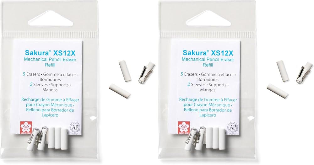 The Sakura XS Series of mechanical pencils features a fixed sleeve that protects the pencil lead when used with rulers or templates. The pencil comes in 0.5mm, 0.7mm and 0.9mm widths for thin to bold lines and maximum versatility when writing or drawing. The refillable eraser is easily accessible under a metal cap, and each XS Series Mechanical Pencil blister card includes three bonus erasers. Eraser refills can be purchased in packs of five with two replacement eraser sleeves.