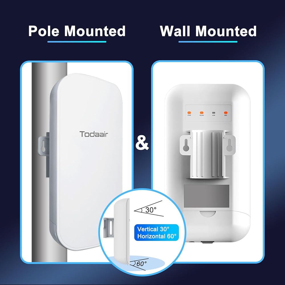 【PoE/DC Power Supply】:The TODAAIR wireless bridge supports PoE 24V power supply and DC 12V power supply, and is equipped with a 100M RJ45 port for easier installation and deployment.