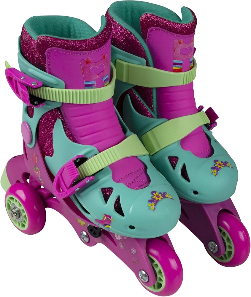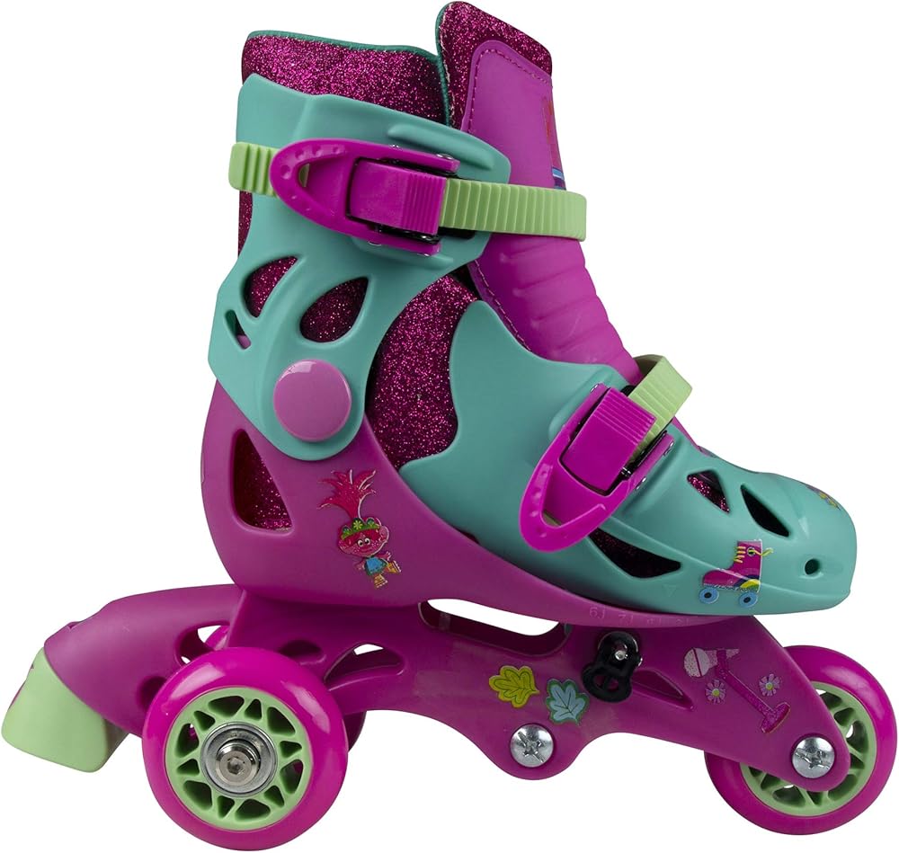 This roller skate set has just what a Trolls fan needs to get rolling! The PlayWheels Trolls Kids Convertible 2-in-1 Skates are perfect for kids at various skill levels of skating. Beginners and skate enthusiasts can enjoy the tri-wheel skate configuration while more advanced skaters can change to the inline configuration in seconds! This set of adjustable skates fit and adjust for a variety of foot sizes between Junior Size 6-9 with the convenient thumb screw - no tools required! These solid convertible skates also feature simple-to-use rear brakes for easy slowing and stopping in either configuration. The sturdy plastic frame and strap buckles are impact resistant and stand up to heavy use, while the comfortable padded liner and articulated ankle support allow for long-lasting outdoor fun and action. With the stylish Trolls theme, this is one set of skates that kids will be proud to wear and show off to their friends! For ages 3-6 and supports up to 60 pounds.