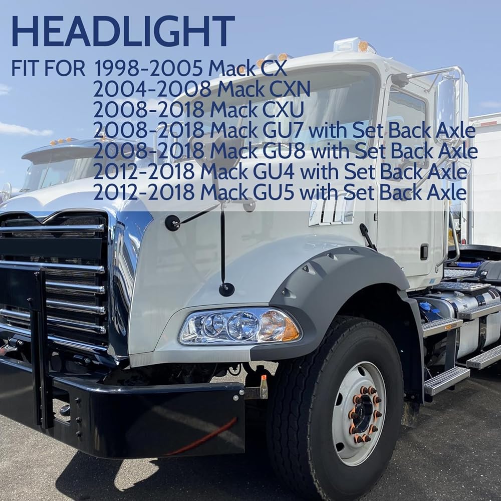 【FITMENT】 Headlight Fit for 1998-2005 Mack CX,2004-2008 Mack CXN,2008-2018 Mack CXU,2008-2018 Mack GU7/GU8 with Set Back Axle,2012-2018 Mack GU4/GU5 with Set Back Axle,Mack Granite,Pinnacle,PS:Does not fit set forward axle GU4,GU5,GU7,GU8 MODELS.