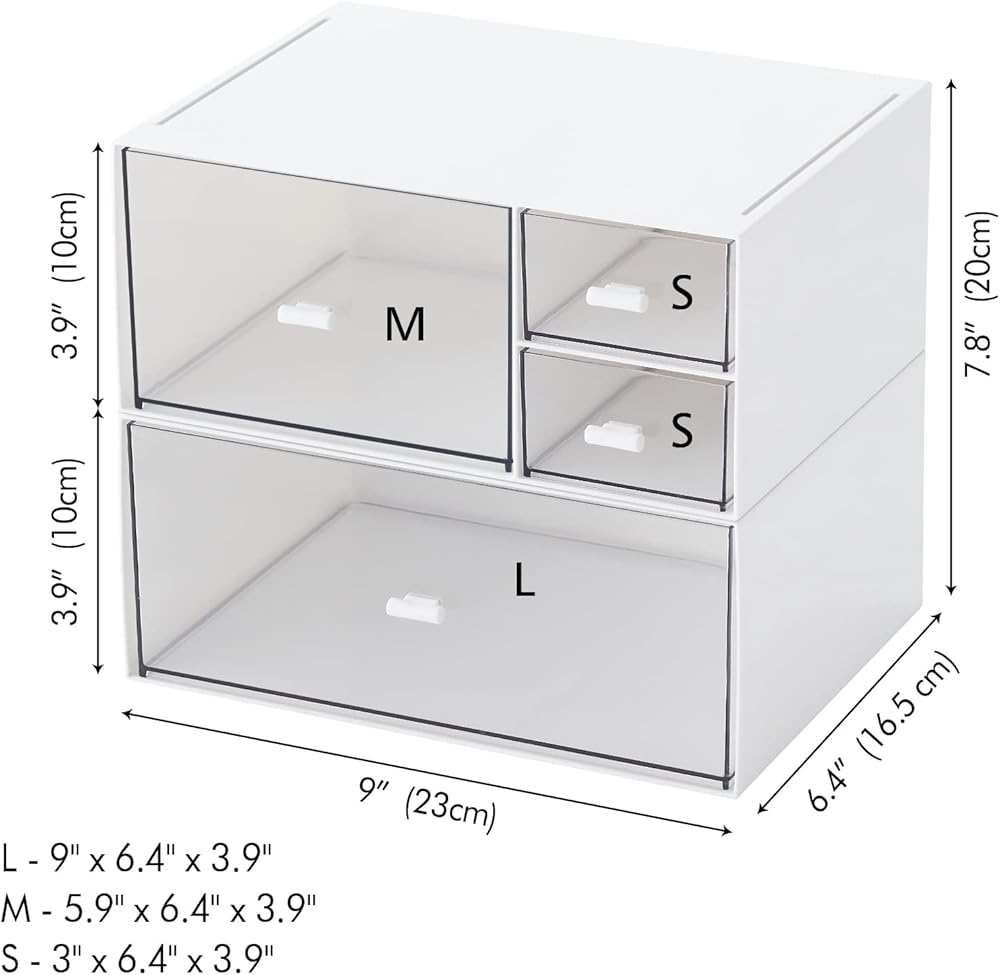 Drawer Sizes Assortment - Each drawer measures about - Drawer L 9" x 6.4" x 3.9"/ Drawer M 5.9" x 6.4" x 3.9"/Drawer S 3" x 6.4" x 3.9", 3 different sized drawers for different sized items, perfect for all your daily essentials.