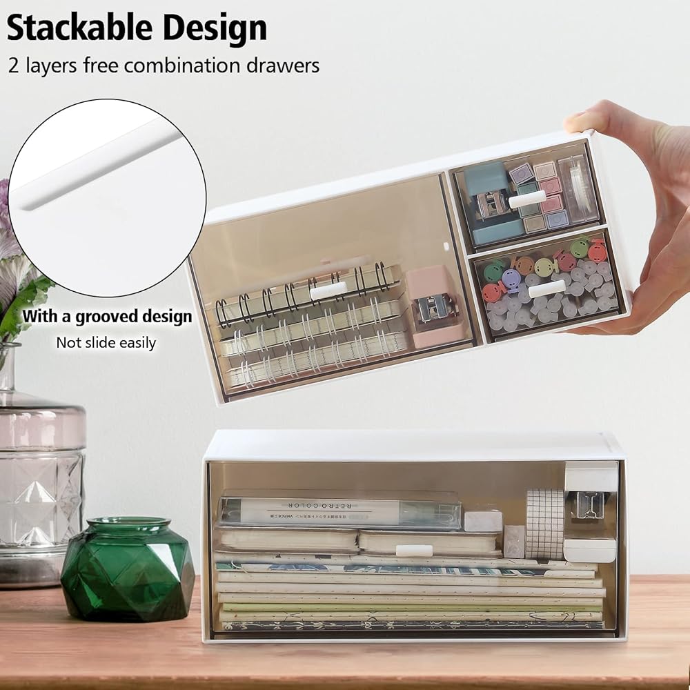 Stackable Design - This desk organizer set has 2 layers free combination drawer that can be used separated or stacked, with a grooved design that does not slide easily, and it is firmly placed. Perfect for desktop organization and storage.