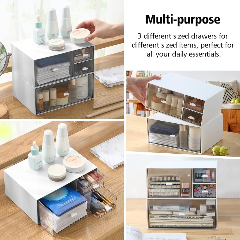 Multi-purpose - The desktop drawers is not only great for storing your makeup brushes, skincare products, liquid foundation, lipstick and other small personal items, but also great for storing your desk stationery like paper clips, pencils, calculators and other office supplies.