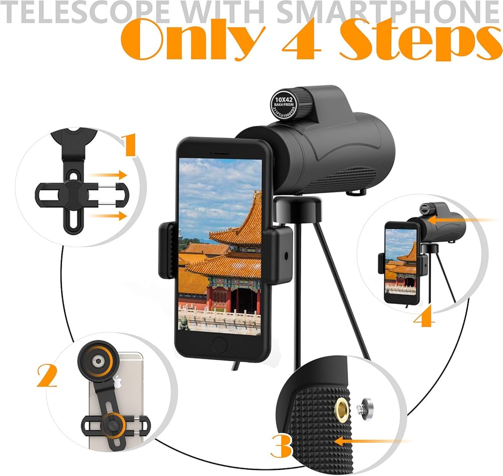 【Keep Your Mini Telescope Stable】 Equipped with a sturdy metal tripod to provide greater stability when gazing at stars or birds, the portable telescope ensures that your photos will never be blurred. Suitable as a hunting monocular, the monocular with smartphone adapter and tripod can also be successfully used as a stargazing monocular, the tripod prevents shaking.