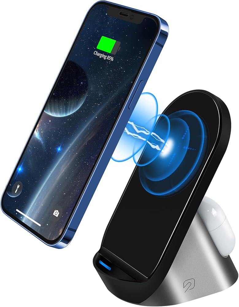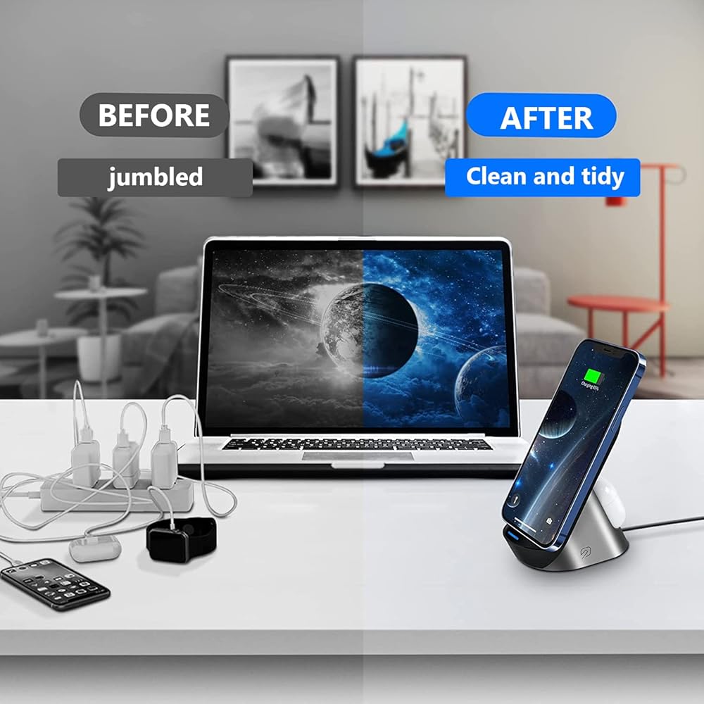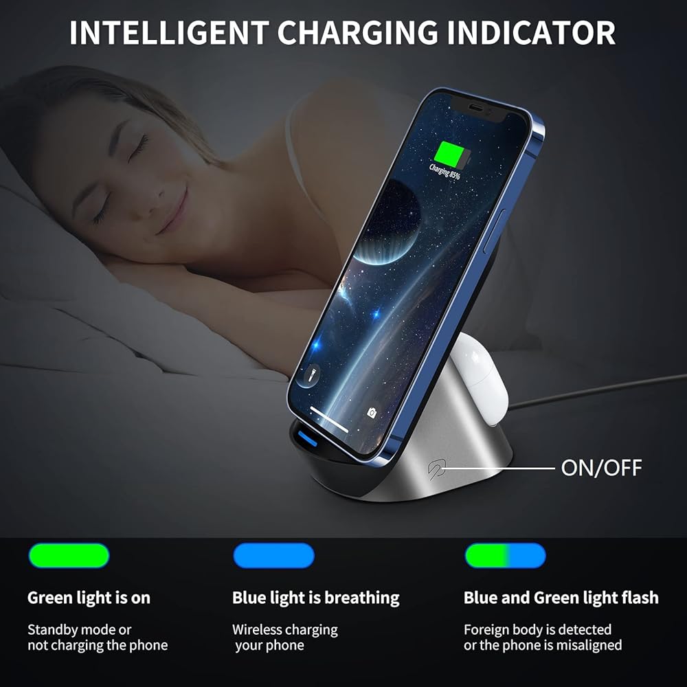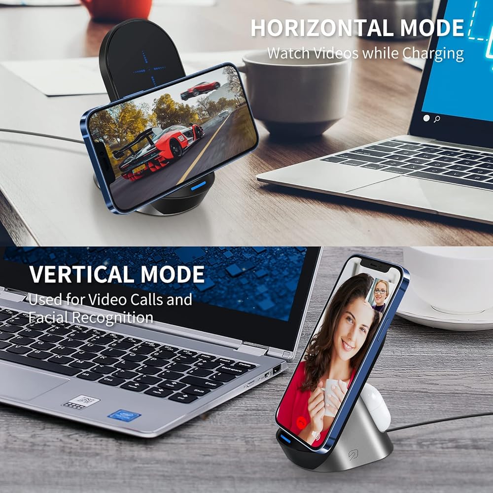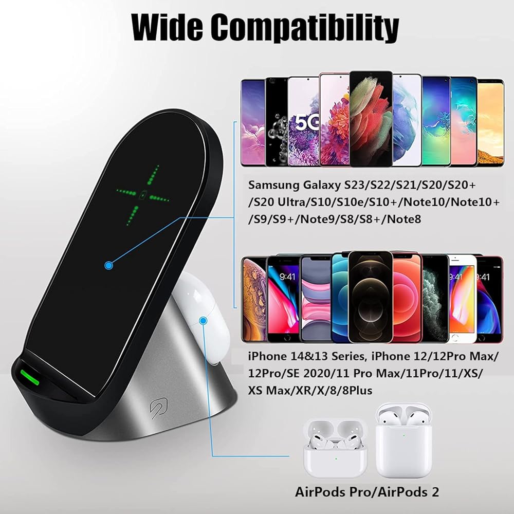 【2-in-1 Wireless Charging Stand】 The Wireless Charger charges your phone and earbuds at the same time. The phone charging stand outputs up to 15/10/7.5/5W for Phones, 3W for earbuds. It compatible with Samsung Galaxy S23/S22/S21/S21 Ultra/S20/S20+/S20 Ultra/S10/S10+/S10e/S9/S9+/S8/S8+/S7/Note 20/Note 10/Note 9; iPhone 15/15 Plus/15 Pro Max/14/14Pro/13/13 Pro/13 Pro Max/12/12 Pro/12 Pro Max/SE 2020/11/11 Pro/11 Pro Max/XS/XS Max/XR/X/8 Plus; AirPods 2/Pro, Galaxy buds, Galaxy buds live and other Qi-enabled devices.